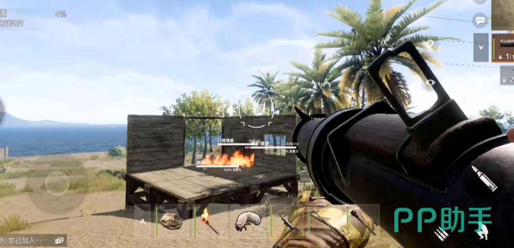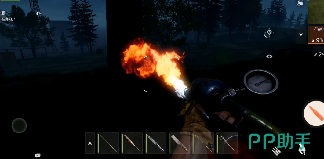 弩箭是比较常规的武器,换弹的速度稍微有点慢。渔枪是只能在水里去使用的武器,开荒时期不是非必要去捡的。还有一把火焰喷射器,使用燃油,能对敌人造成范围伤害,旁边即使没有草,也可以被点燃,木质的建筑物也是可以的。