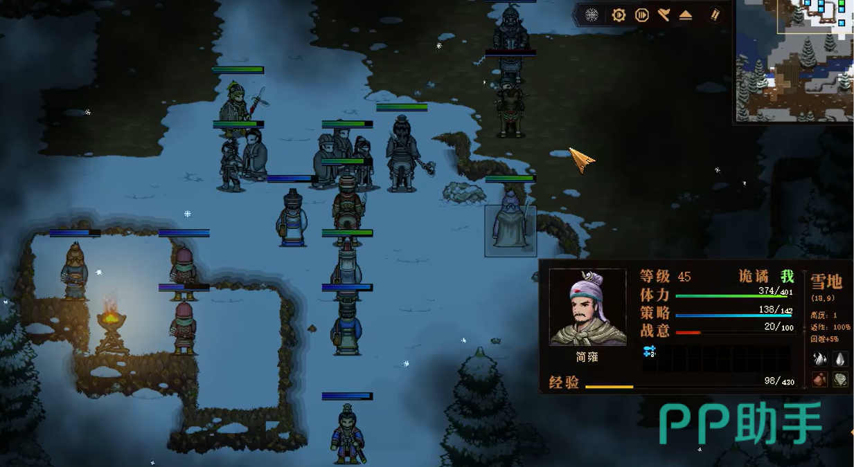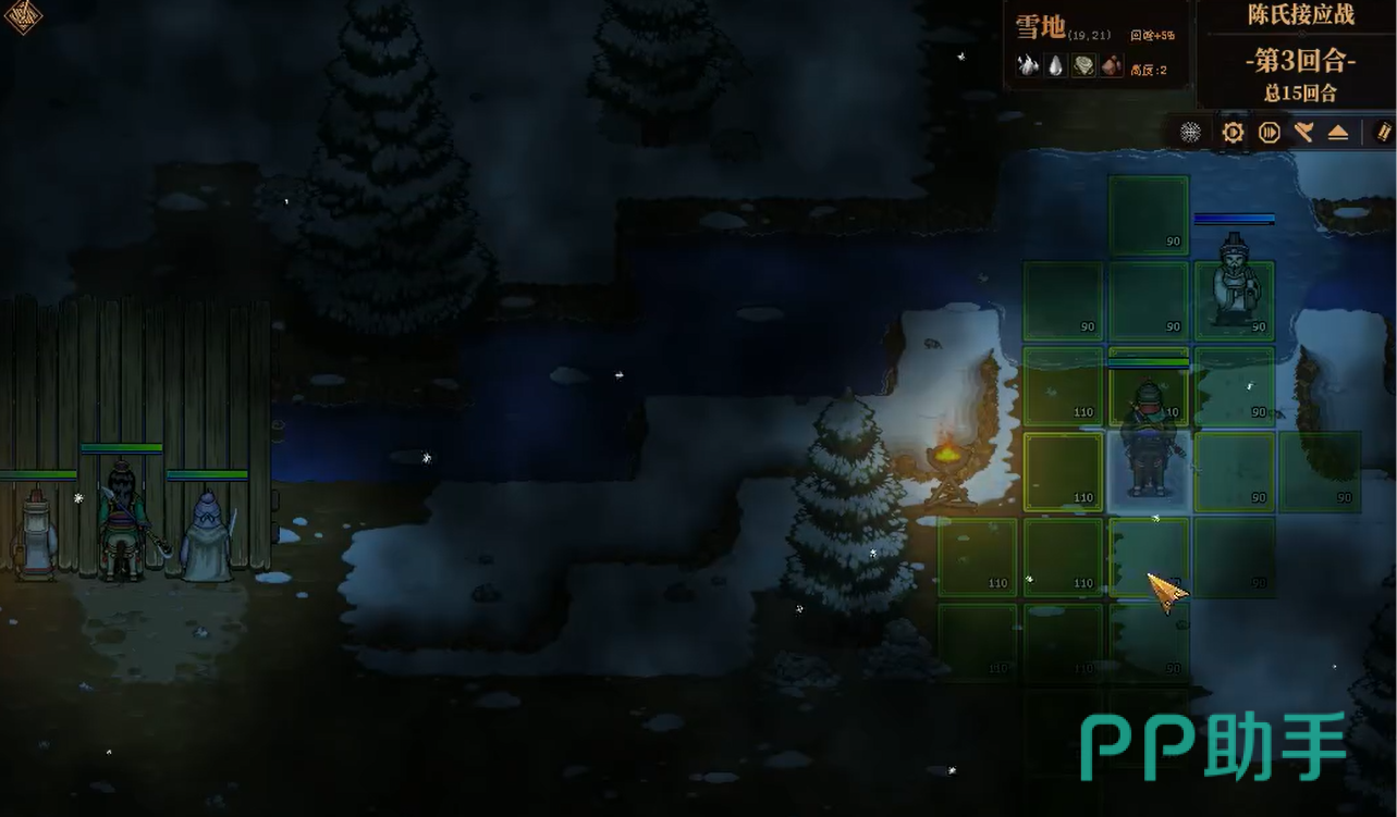 到了后面时,所有的友军都已经聚集在一起了,然后再将几个残余的虾兵蟹将解决掉就好。这时将最后的行动放在撤退即可,大概一两个回合就能搞定。不过也要注意陈氏的血量,只要不低于20%即可,可以适量加一下血,避免被寒冷天气冻死了。