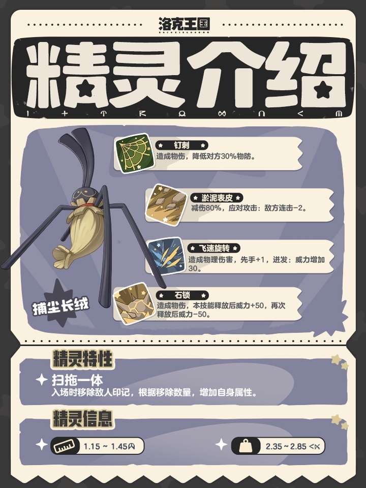 玩家们可以先不断的提升他的等级,等等级达到之后就可以来进化成食尘短绒,作为一个地系和虫系双属性的宠物,玩家们在对战的过程中可以更加具有优势,拥有多种特性,可以来对抗不同的敌人,无论是电系还是毒系或者石系,火系都有明显的克制效果,后续玩家们还可以进化成捕尘长绒,可以来实用灰尘进行清洁,他的种族值也是非常高的。