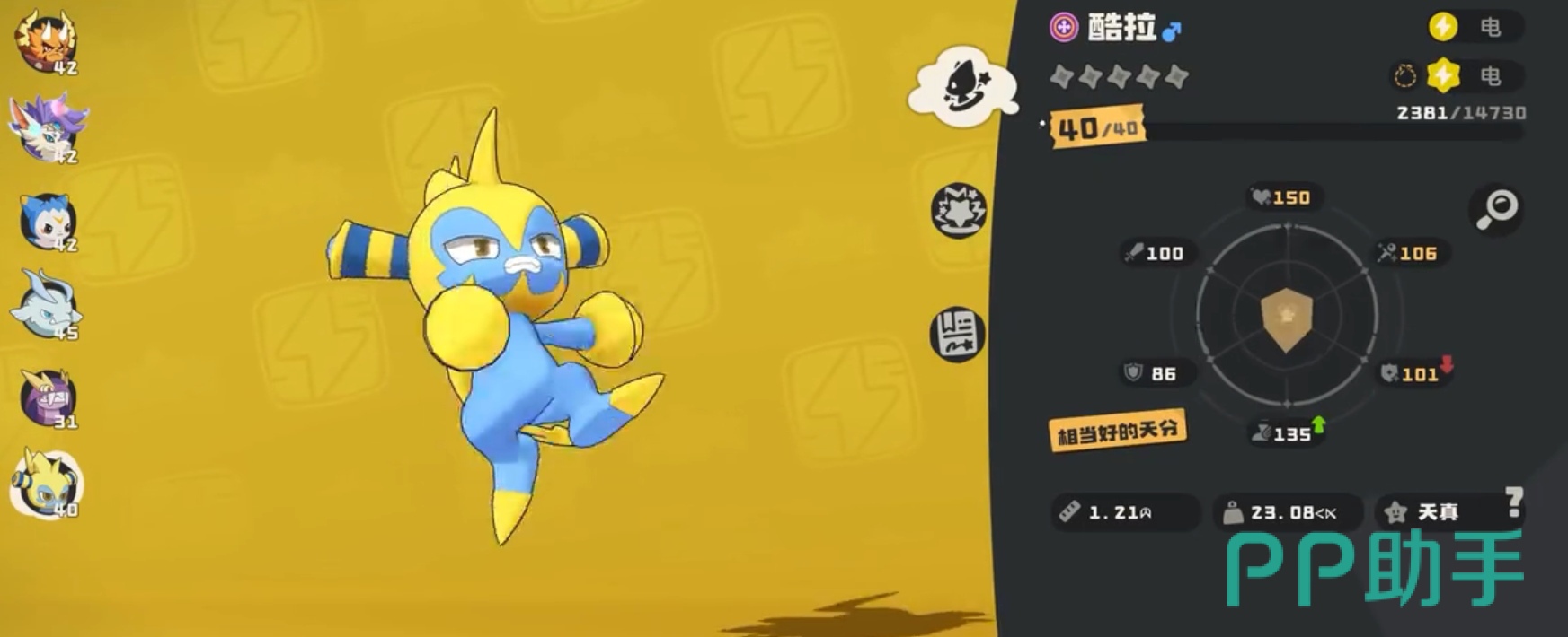 推荐二:酷拉,它在游戏中是备受欢迎的一种电系精灵,是拉特进化而来,有着异常出色的实力,在魔法攻击与速度这两个领域的种族天赋十分高。小伙伴们可以在使用它的专属特性【二次施法】时,一次性将所有的可选择性技能全部释放出来,最重要的是库拉处于对抗战场的时候是可以连续打出两次伤害技能,很适合在快节奏的环境进行输出和控制。在选择性格的时候,小编是建议各位优先选择急躁或者浮躁,这两种性格可提高速度的时点加成。