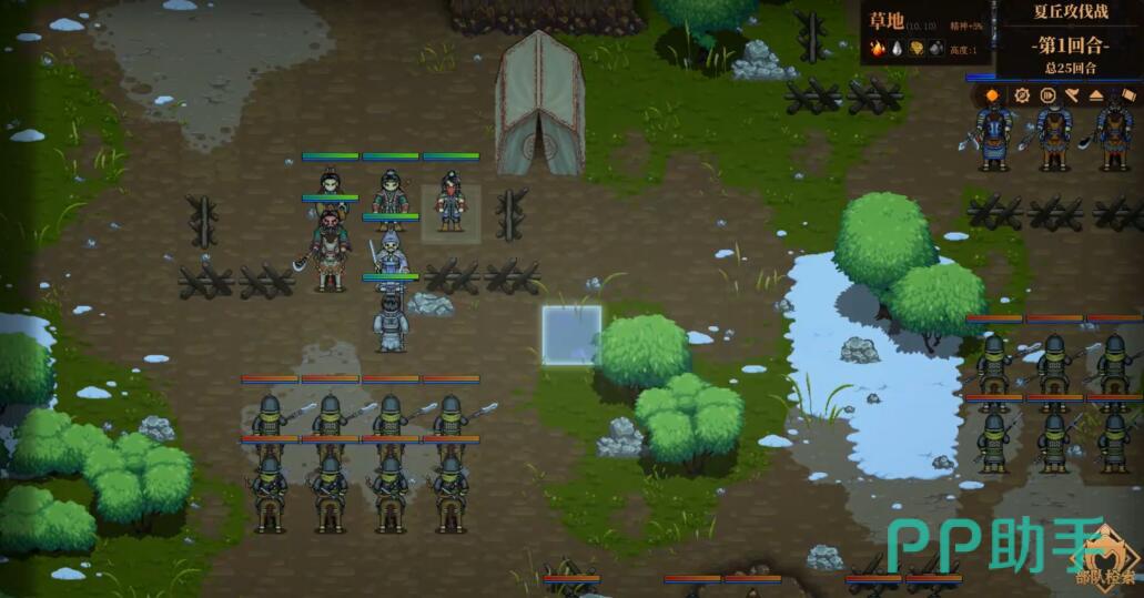 战场中部的森林区域是关键防御点。控制刘备、简雍在此要给出全buff以及治疗,利用树木的20%闪避加成抵消敌方骑兵冲锋。若张辽在第五回合后仍未撤退,可激活隐藏道具火油罐对其所在区域施加燃烧伤害。
