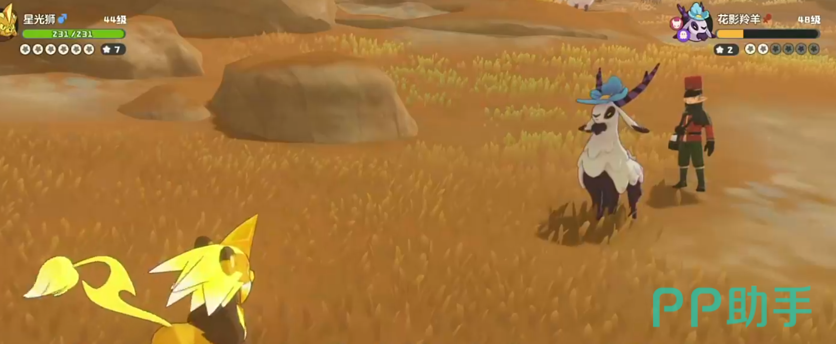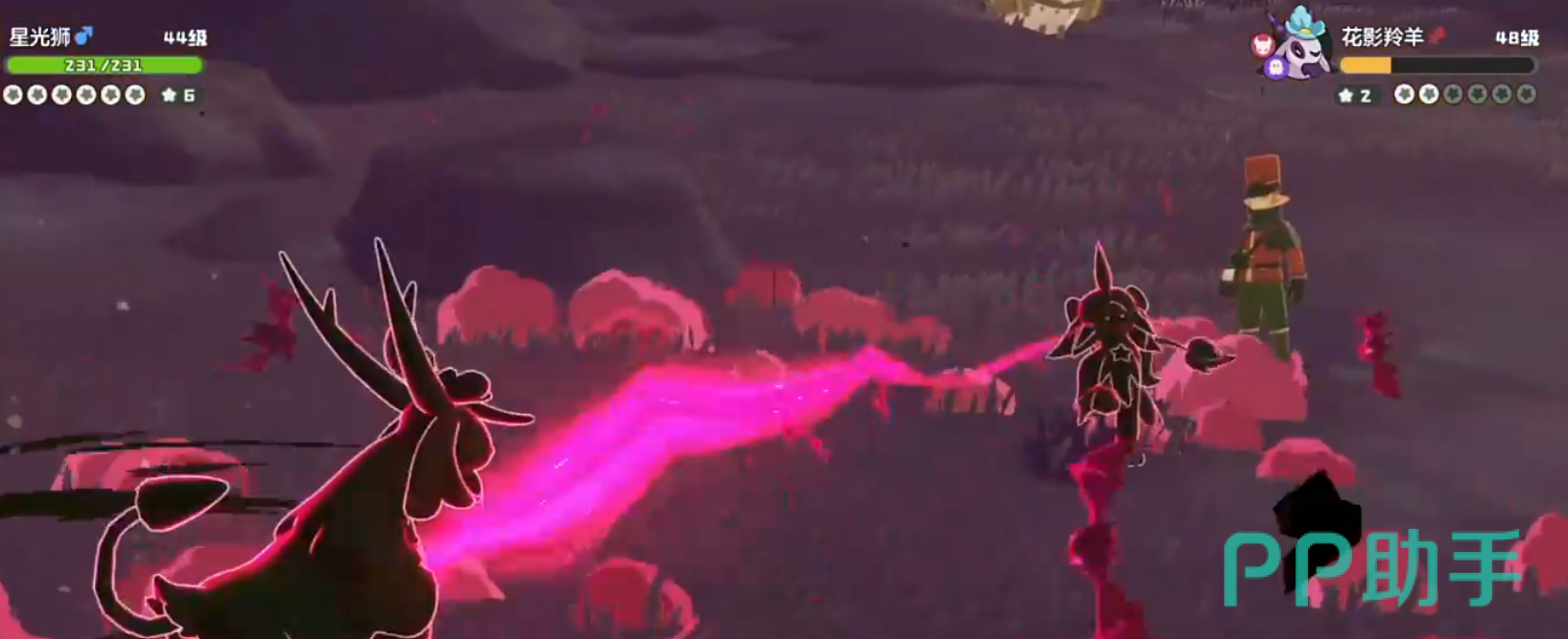 接下来就是第二场战斗,他派出的精灵是一只花影羚羊,花影羚羊是恶加幽灵属性的,虽然是拥有两种属性的精灵,但对电光狮是没有什么克制关系的,我们可以不用切换精灵正常攻击。
