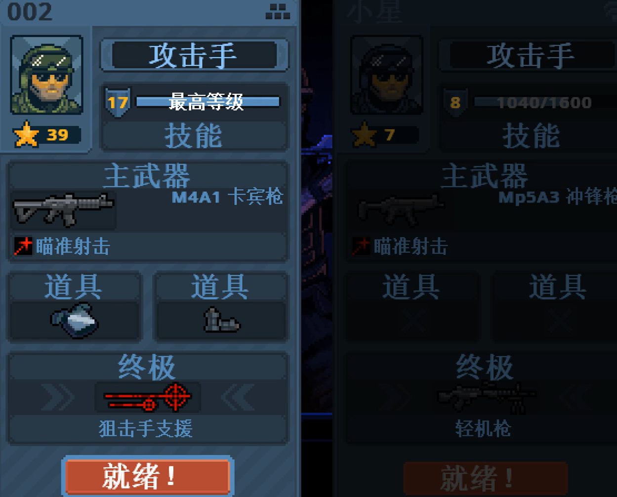 在这款游戏中玩家将要扮演两名特警,在准备界面中玩家可以选择自己本剧携带的武器、道具以及终极技能,在准备好后就需要进入游戏当中营救人质,游戏中玩家将采用横板2d的视角进行对战。