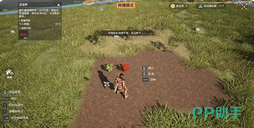 例如溜溜果,这时候,就可以在开垦好的土地上种下种子了,当要种子的作物是红色时,也就代表当前的种植空间不足,这样是会影响到作物的正常生长的,无法种下,只需要稍微移动位置,变成绿色时,就能成功种下了。