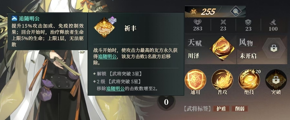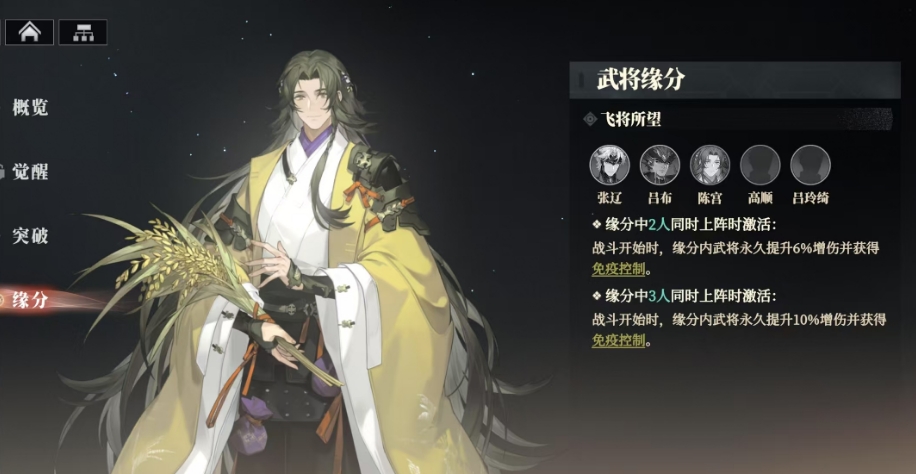 即便其中仅有两人并肩作战,战斗的一开始他们便能获得永久性的6%增伤提升,并免疫一切控制效果,而当三人或更多战友同时上阵的时候,这份力量更是飙升至10%的增伤加成,配合免疫控制的霸道效果,这样的缘分设定,不仅丰富了陈宫作为辅助与控制角色的战斗策略,也让他在特定武将组合中如鱼得水,能够更完全展现其战术价值。