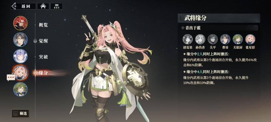 但另一方面张星彩在全女团玩法中似乎有更好的用法,因为女团玩法充分利用了巾帼阵营的加成优势,而张星彩的武将缘分青出于蓝更是为这一玩法增添了加成机制,当缘分中的2人同时上阵时,从第3个战场回合起,这些武将将永久获得 6%的攻击和防御加成,而当4人同时上阵,激活更深层次的缘分效果时,这一加成更是提高到了10%,这一强大的缘分效果由孙尚香、曹昂、关平、诸葛果、关银屏以及张星彩本人共同激活。