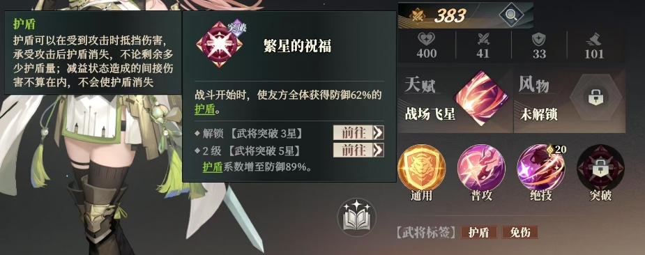 张星彩在游戏中的定位为防御型武将,她来自吴国阵营,同时也是巾帼武将的一员,其天赋效果颇具特色,当任意友方的护盾被耗尽时,自身便能够提升最多10%的行动条,她可以及时为队友提供支援或应对敌方的攻击,而她的绝技更是团队防御的基础效果,可为友方全体施加一层护盾以及星之守护效果。其中,星之守护能够带来 10%的法术免伤提升,不过该效果可以被驱散。