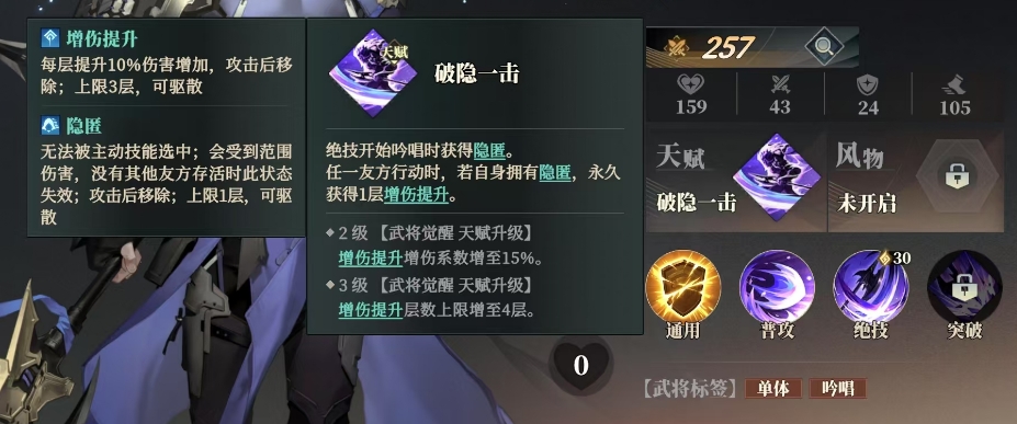 当友方行动时,若自身处于隐匿状态,那么将获得增伤提升,这一效果每层可增加 10%的伤害,在攻击之后才会移除,并且最多能够叠加三层,值得注意的是,在隐匿状态下,张辽无法被主动技能选中,但会受到范围伤害,这样一来,其实大家运用好张辽的核心诀窍便在于巧妙地积攒层数,待时机成熟,以破隐一击的姿态直接秒杀对手,这样就能够用处这个武将的优势啦。