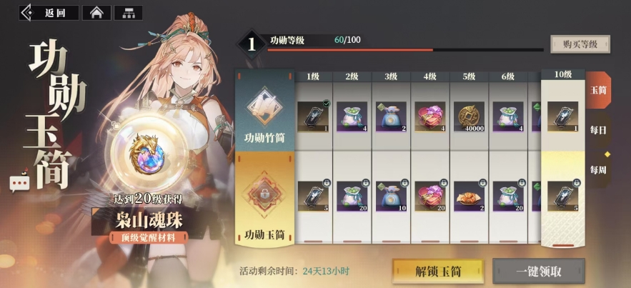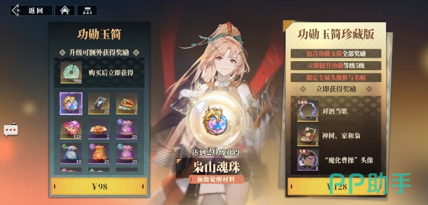 除了基础玉简所提供的丰富奖励之外,游戏里还设有功勋玉简和功勋玉简珍藏版,这两种玉简需要玩家通过氪金购买的方式来获取,其中功勋玉简的价格为98元,当玩家购买之后,可以立刻获得980的三山壁,这无疑为玩家在游戏中的资源储备提供了强有力的支持,同时还能获得一系列的资源奖励,包括一个天赋升级材料枭山魂珠,这对于角色天赋的提升可是起着至关重要的作用。