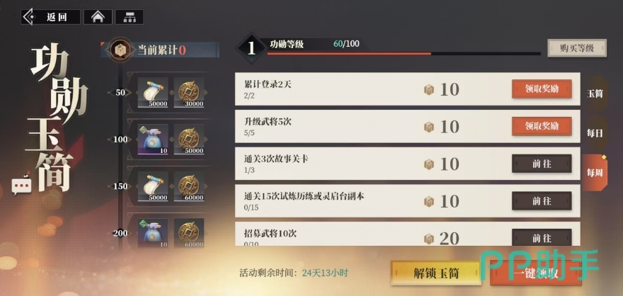 整个玉简系统的活动时间安排得十分合理,大概会持续一个月左右,在这期间每周任务都设有与之对应的专属奖励,玩家每周都可以依据自己完成任务的情况,去领取相应的奖励,而且随着功勋值的不断积累和提升,玩家的功勋等级也会随之逐步提高,当功勋等级达到特定的顶级时,玩家将获得功勋竹简奖励,这种奖励就如同手游里比较常见的常规战令奖励差不多。