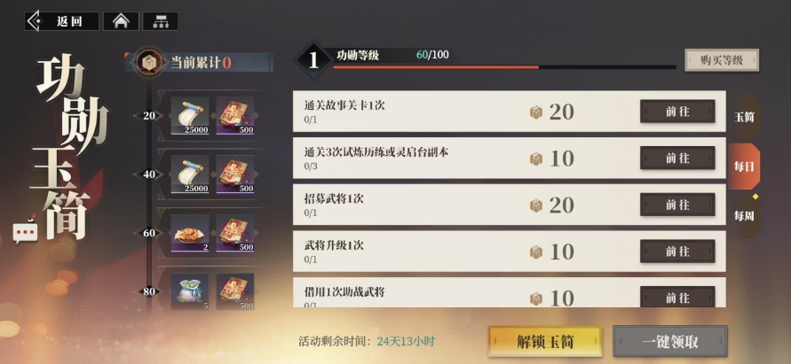 这里的玉简系统和其他游戏中常见的战令系统有着一定的相似之处,玩家可以在游戏主界面左下角的目录当中,进而进入这个系统,进入玉简系统后,首先映入眼帘的便是功勋值的获取方式,玩家通过完成每日任务以及每周任务,都能够获得相应的功勋值,每日任务的内容可谓是丰富多样,几乎涵盖了游戏里各种各样的玩法和活动。