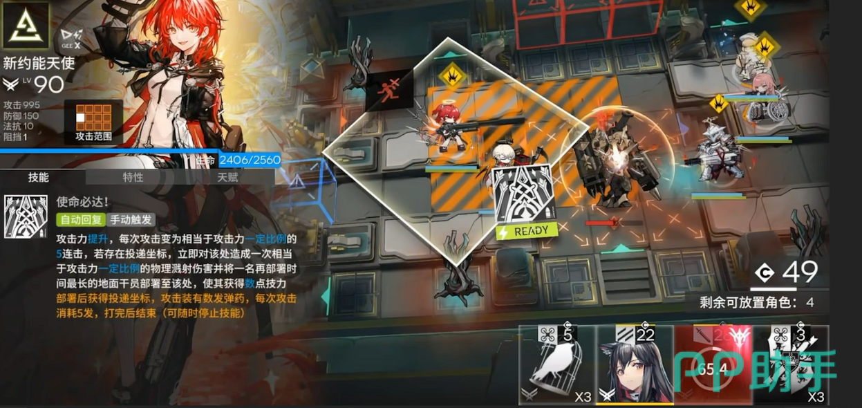 至于三技能“使命必达!”,这简直就是她的“爆发时刻”。能天使每次攻击变为5连击,且每次攻击后都能造成物理溅射伤害。更为特别的是,能天使可以在攻击时直接投递坐标,将队伍中的地面干员部署至指定位置,并为该干员提供技力。你不仅可以通过这个技能加强其他干员的战斗力,还能在合适的时机为他们提供战术支援。这项技能可以随时结束,并且具有高度的灵活性,使用时要注意掌握时机和弹药的分配。