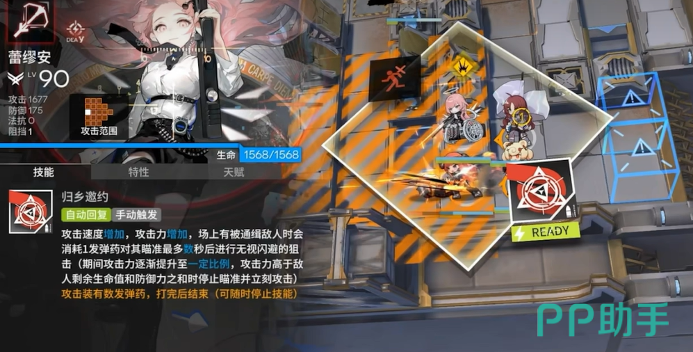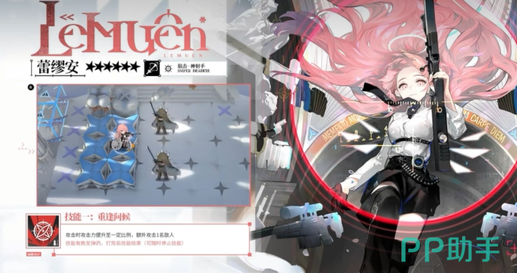 至于她的技能,蕾缪安展现出了她的多面性和战略性。第一技能“重逢问候”让她在攻击时增强自身的攻击力,并额外攻击一名敌人。这个技能不仅能提升她的输出,还能在关键时刻攻击到更多敌人,快速清理战场。而二技能“归乡邀约”则是她最具特色的技能之一。开启后,她的攻击速度和攻击力都能得到显著提升。更重要的是,如果场上有被通缉的敌人,她还会消耗弹药进行精准狙击,这一狙击可以无视敌人的闪避能力,并且攻击力会随着时间逐渐增强。想象一下,当敌人残血时,她的这一击可以直接决定战斗的胜负。