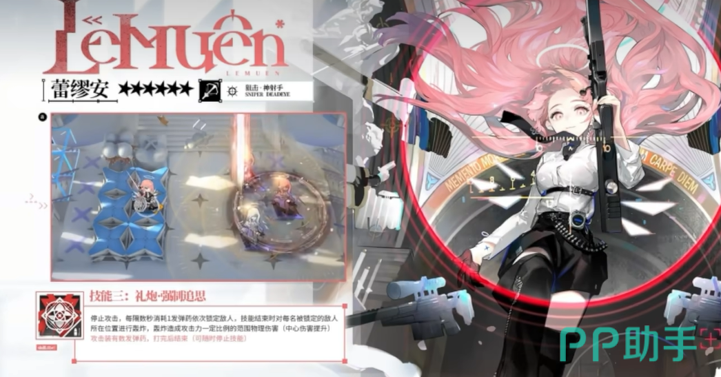 至于她的三技能“礼炮·强制追思”,这是一项超级华丽的技能。蕾缪安在停止攻击后,会锁定多个敌人,每隔一段时间消耗一发弹药,依次轰炸被锁定敌人的位置。每次轰炸都会造成相当可观的物理伤害,且中心的伤害更为强烈。如果战场上的敌人集结成群,蕾缪安的这一技能可以说是非常致命,足以瞬间改变局势,重创敌军。