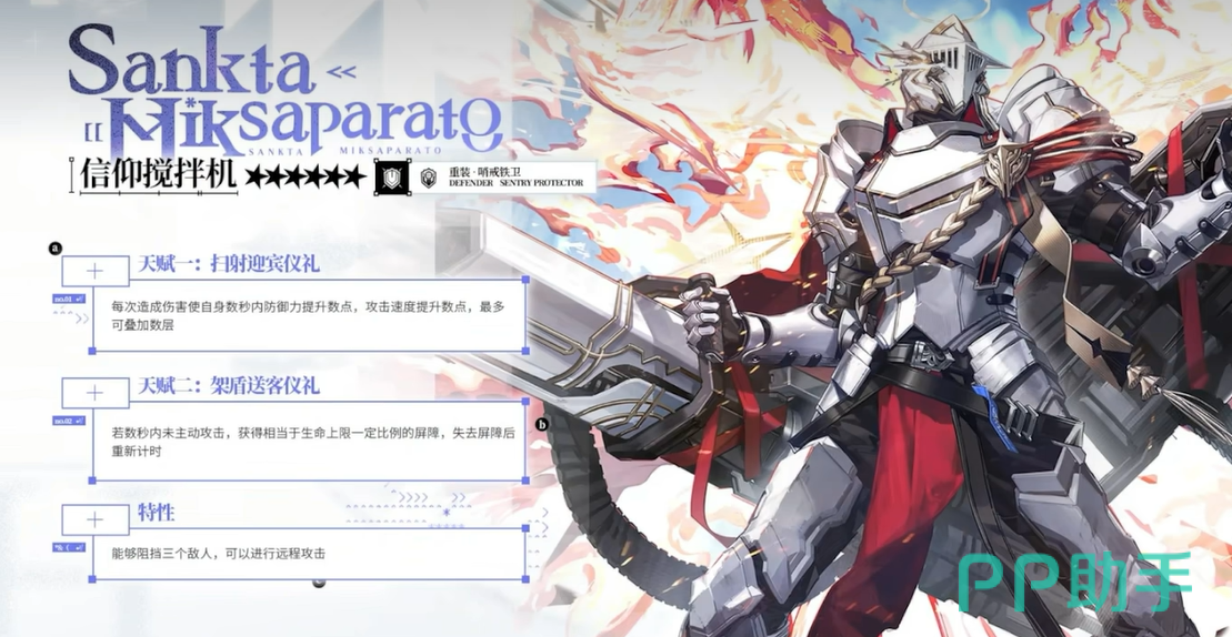 信仰搅拌机,听名字就有点意思,这可不是一位普通的重装干员,而是活动限定的六星干员之一——他就是明日方舟六周年庆推出的哨戒铁卫新星,信仰搅拌机。今天小编就带来明日方舟信仰搅拌机介绍。正如他的名字所示,这位新干员不但有着厚重的防御,还带着一股“搅动”战场的强大力量,能够在不同的情况下为队友提供强力支援。
