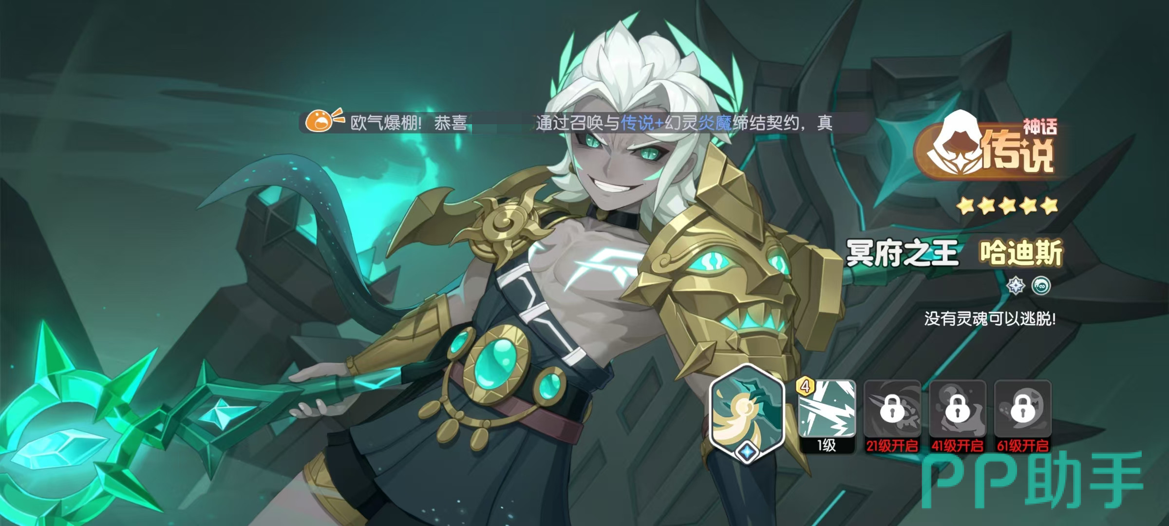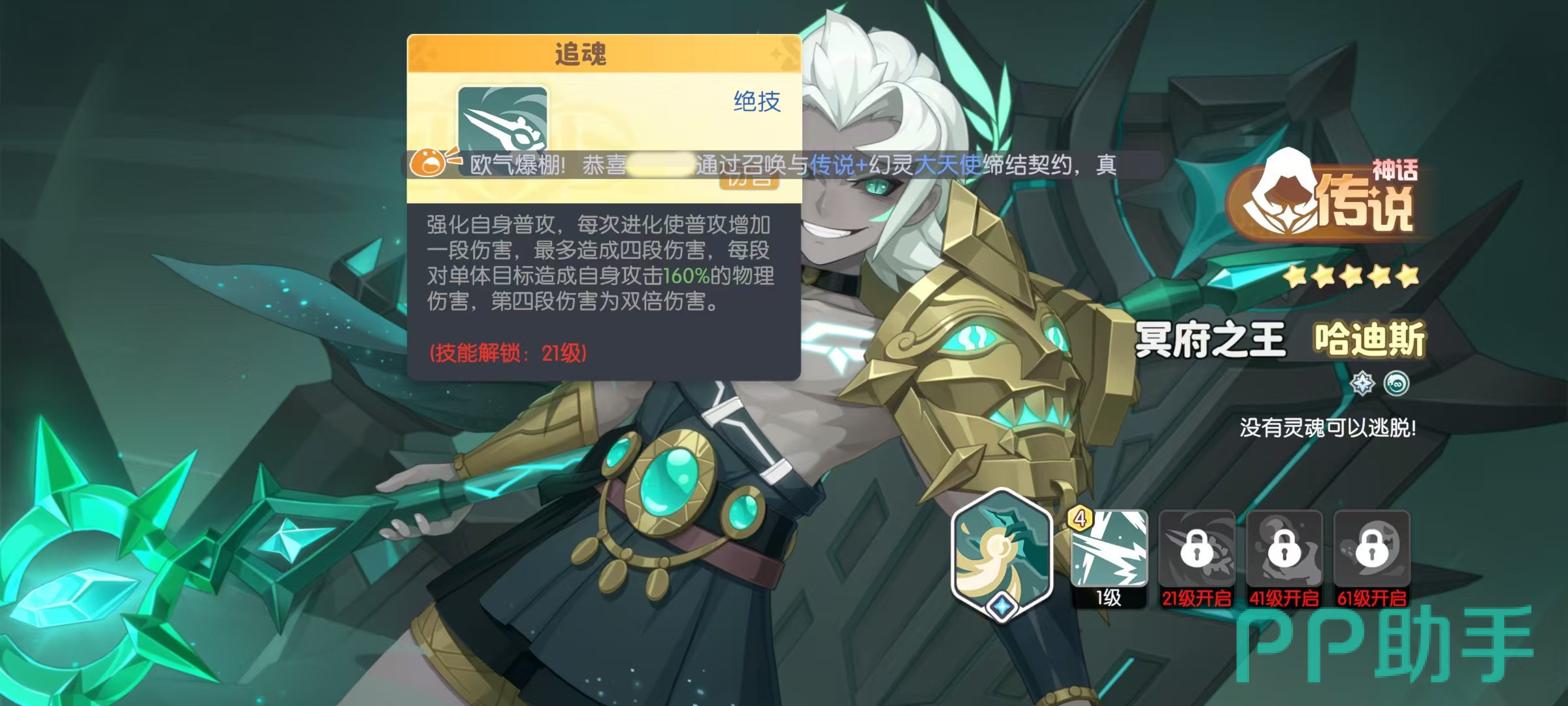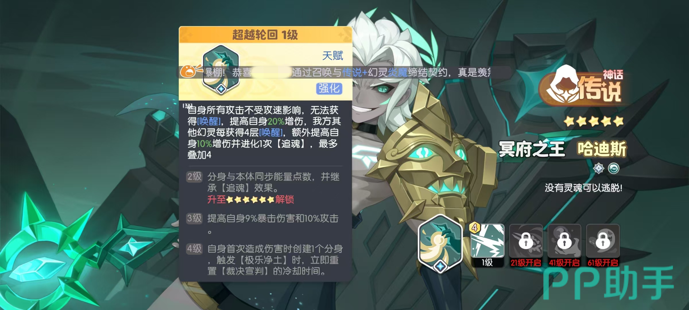 哈迪斯的天赋超越轮回,自身所有攻击都不受攻速影响,无法获得唤醒效果,但是能提高自身20%增伤,我方其他幻灵每获得4层唤醒,就能额外提高自身10%增伤,并进化一次追魂,最多叠加4次。唤醒是属于奥术阵营的特殊状态,任意我方幻灵释放奥义,都可以获得这一效果。在进行天赋升级之后,自身提升暴击伤害和攻击力,以及分身和本体都能同步能量点数,并继承追魂效果。