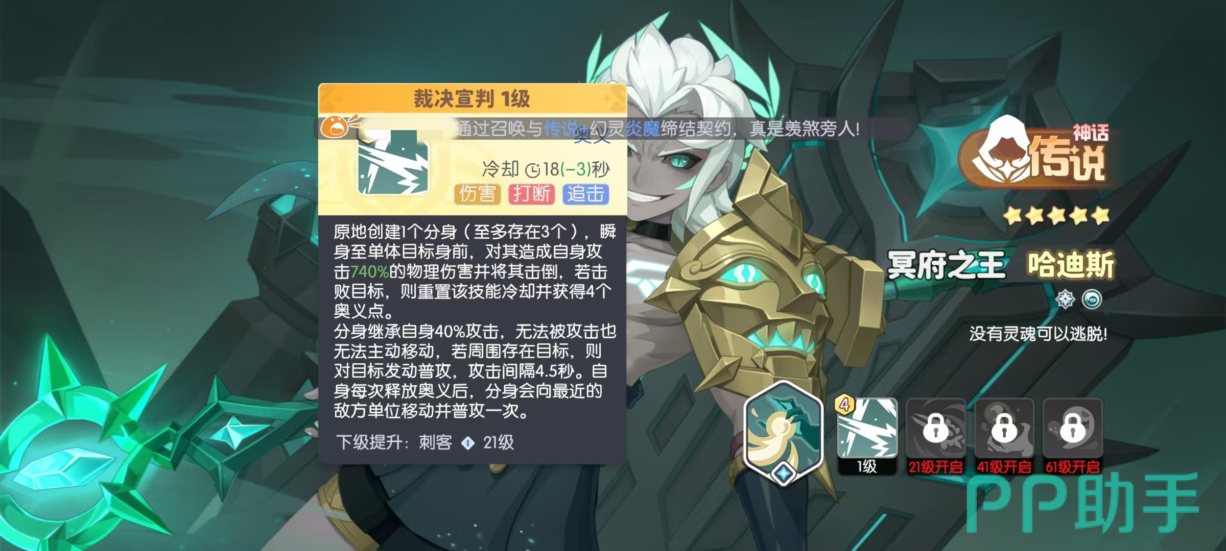 奥义技能裁决宣判,哈迪斯原地创建一个分身,瞬间至单体目标前,对其造成740%攻击力的物理伤害,并将其击倒。如果击败目标,该技能冷却时间重置,并获得4个奥义点数。分身最多存在3个,分身继承自身40%攻击,无法被攻击也无法主动移动,如果周围存在目标则自动发动攻击。绝技追魂,强化自身普攻,每次进化,后普攻都能增加一段伤害,最多达到四段伤害。秘技无情猎手,攻击时根据自身已经损失的生命值百分比提高伤害。特技极乐净土,每当我方单位被击败时,自身获得一层遗言,每层能提高1%攻击力。