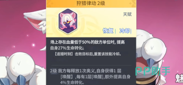 芬里尔天赋当场上有半血以下单位的时候自身吸血提高,奥义完成击杀可以重置冷却,6星的时候解锁2级天赋,每次释放奥义叠加唤醒buff,每层唤醒有额外4%的吸血。后续天赋中有加攻击、触发元素反应加攻击,奥义击杀目标后得到2个奥义点。