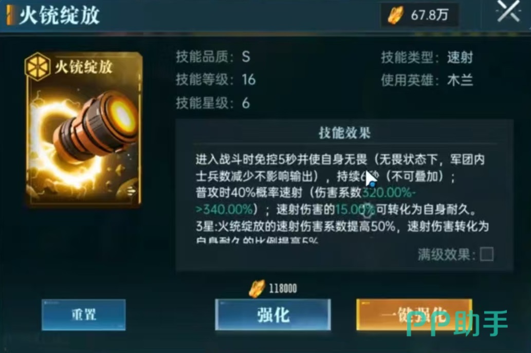 先来看一下木兰这个英雄的基本情况,她是属于游戏中的速射类型,主要技能火铳绽放,进入战斗时免控5秒,并使自身处于无畏状态。该状态下军团内士兵数量减少,但是不影响输出,持续6秒钟,在进行普攻时有40%几率触发速射。速射伤害10%可转化为自身耐久,在升星之后,速射伤害系数和伤害转换都有所提升。