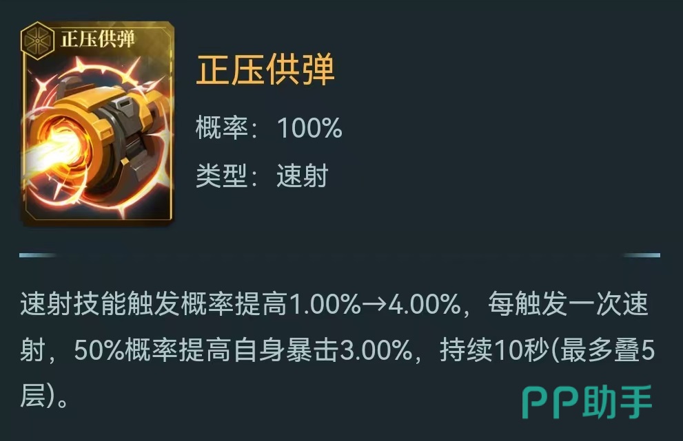正压供弹的效果是提高速射技能触发几率,每一次触发速射有几率提高自身暴击,最多能叠加10层,持续10秒钟。密集阵线的效果是提高速射伤害,每触发一次速射能提高自身火力,最多叠加5层,持续10秒钟。这样一来速射队的持续作战能力就再次得到了加强。负压供弹提高速射技能触发几率,每造成一次伤害,都能降低目标伤害抗性。磁轨速射在普攻时有几率触发速射,触发之后使目标有几率短路。