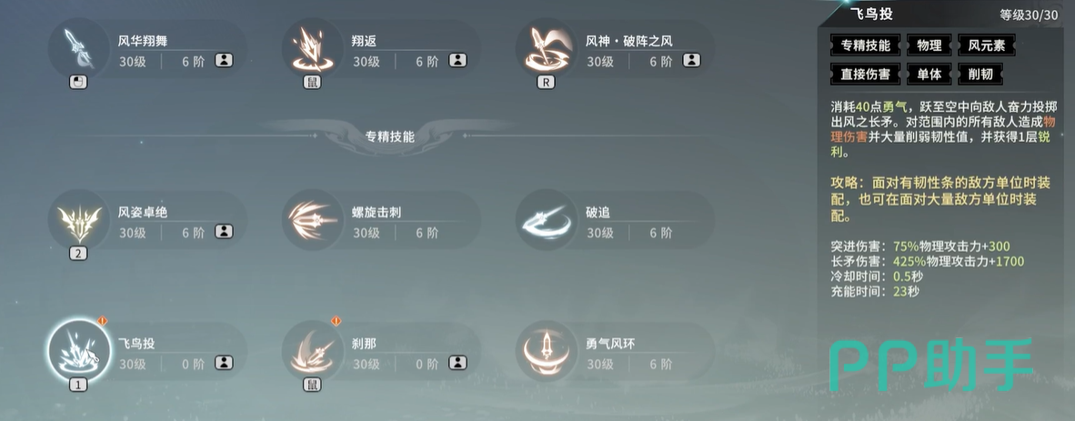 之后就是其他技能的加点,优先选择飞鸟投,刹那和锐利冲击,这三个技能是可以跟翔返进行连段的,基本上 一套下来很容易秒杀小boss以及怪物,而且整套技能下来可以展现出空战骑士的独特性。