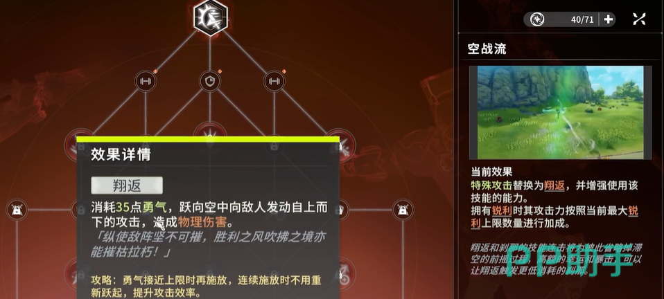 首先就是空战骑士的技能加点,首先需要选择空战流派,这个流派的效果就是特殊攻击直接换成翔返,这样玩家们就能顺利进入空中发动后续的连击,接着就是其技能的分支几个技能需要重点选择,第一个是追击身法,该技能可以优化空中的连招间隙,其手感方面会更好。