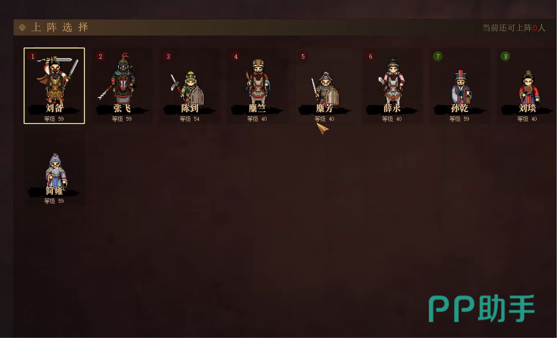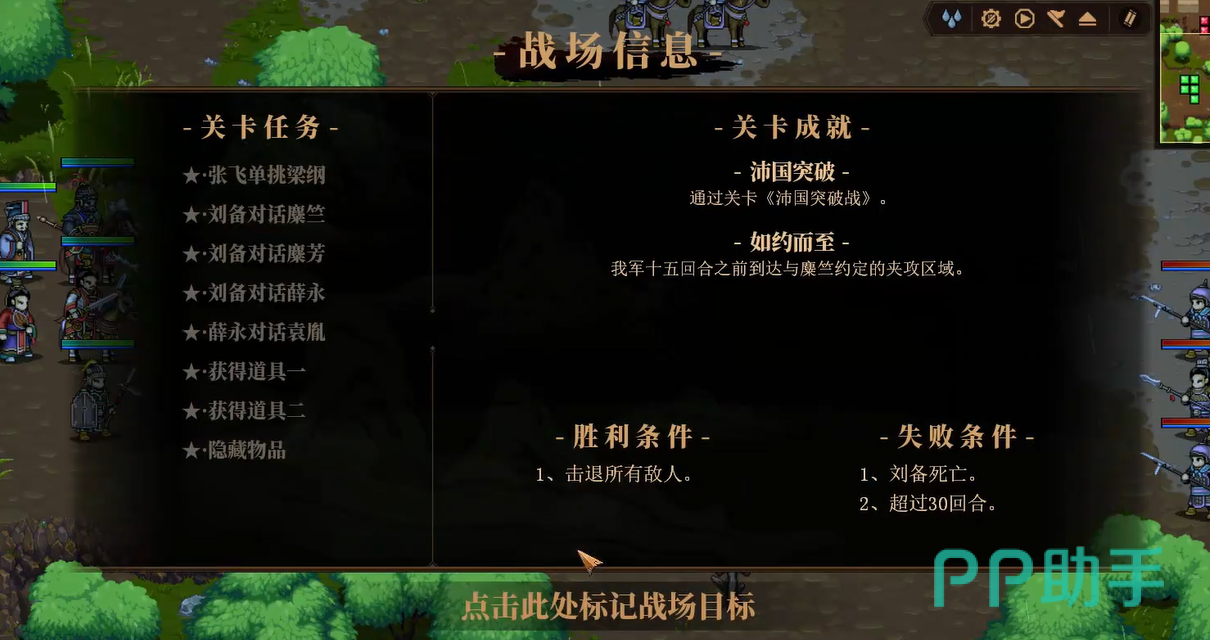 这关的要求就是击退所有人,并且避免刘备阵亡,不超过30回合。所以这关如果让刘琰带着六韬30回合结束的话,经验会溢出,所以给出场不满但等级较低的糜芳带大韬。这关重点就是早点到会和区域,并且把糜竺等人早点喊出来。