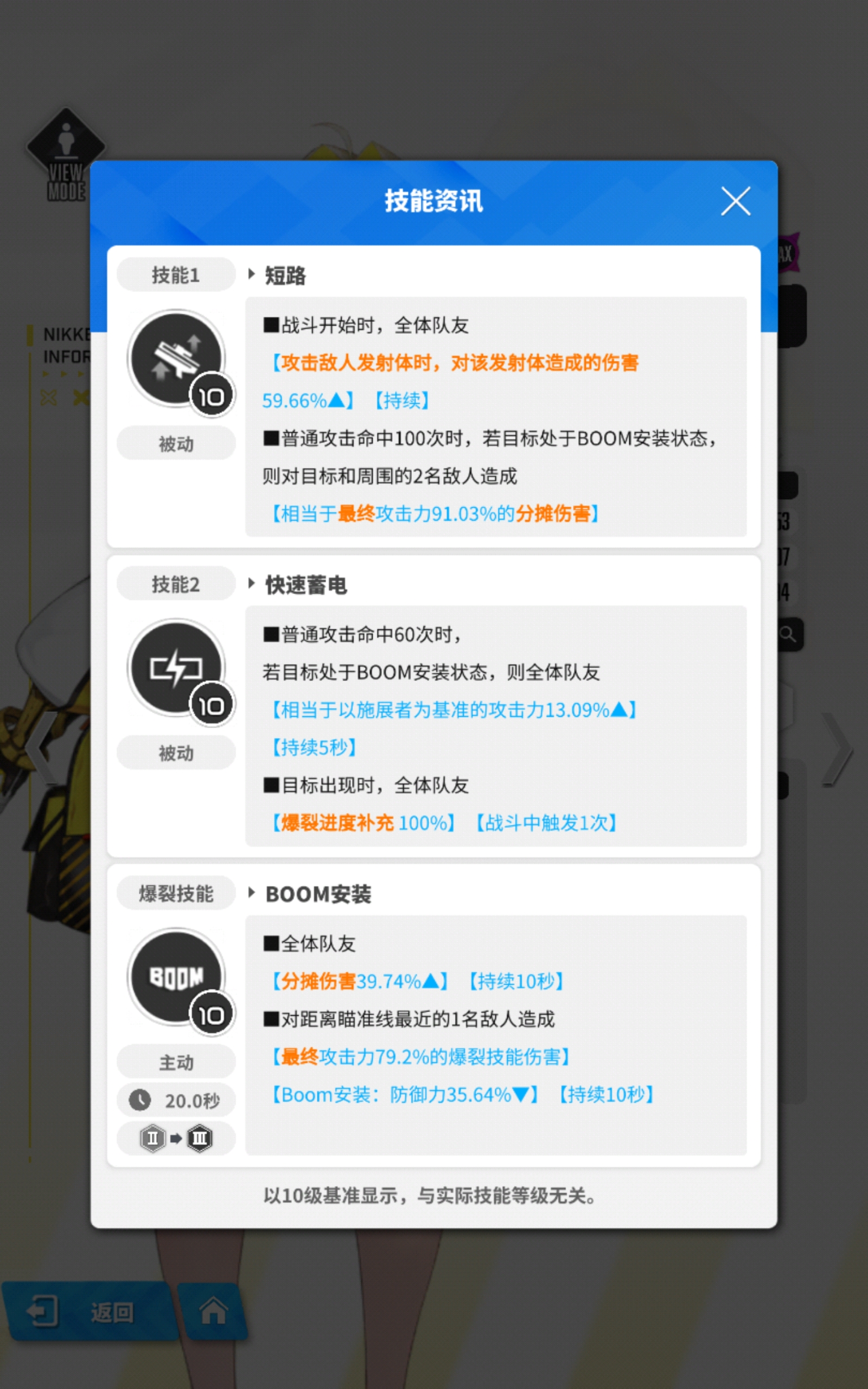 伊莱格的的被动技能短路,在战斗开始时直接提升全队对发射体的伤害,当普攻累计命中100次且目标处于BOOM状态时,可对目标及周围两名敌人造成额外的分摊伤害。这意味着在对抗群体敌人时,她的范围输出能力会显著提升。二技能快速蓄电在普攻60次命中BOOM状态目标后,能为全队提供基于自身攻击力一定比例的增益,持续5秒,配合装备加成可形成近乎常驻的攻击力提升效果。主动技能BOOM安装则是战术核心,不仅降低最近目标的防御力,还能让全队分摊伤害提升。