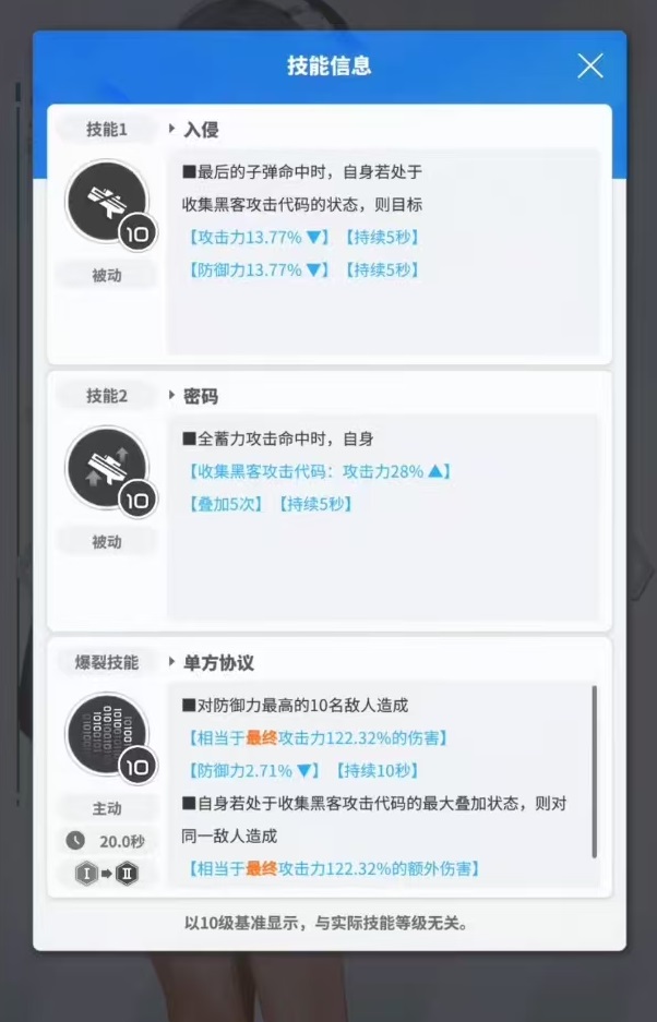 在国服中,海伦是属于宙斯盾部队,她的第1个技能是被动效果阵前指挥,当最后的子弹命中时,全体队友获得14.64%的普通攻击暴击率提升效果,持续5秒钟。当进行全蓄力攻击时,全体队友恢复相当于施展者最终最大体力0.59%。第2个技能同样是被动效果开炮,对全体队友施加一个阻挡部位攻击伤害提升3.08%的效果。这是属于一个持续状态,当全爆裂时间开始时,全体队友攻击伤害提升16.35%,持续10秒钟。