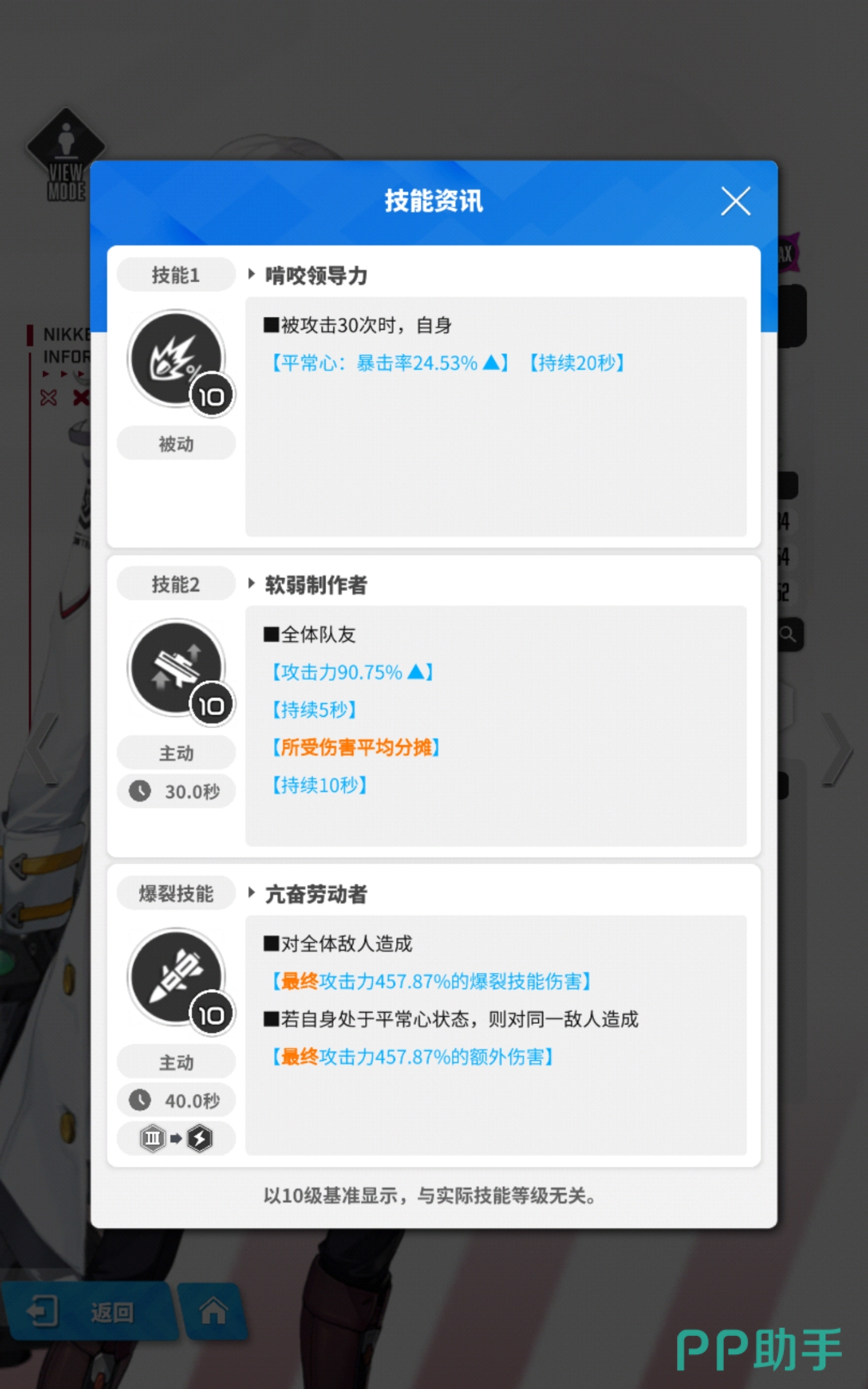 尤尔夏的被动技能啃咬领导力在被攻击30次后触发,能提升自身暴击率并持续20秒,这个机制让她在承受火力时越战越强。主动技能软弱制作者则是团队的保命关键,能为血量最低的5名队友,提供额外的攻击加成,同时开启10秒伤害分摊效果,相当于给脆皮输出角色套上一个护盾。而她的爆裂技能亢奋劳动者,在平常心状态下,能对全体敌人造成两次高额伤害,配合破防效果可瞬间清场。