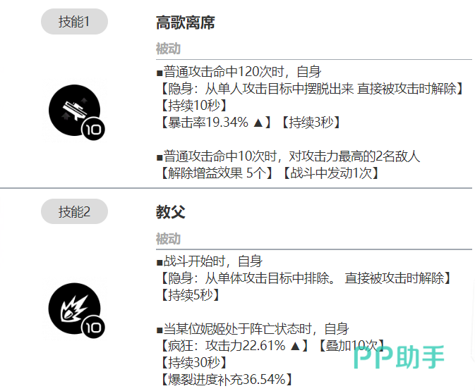 技能2叫做教父,战斗开始后隐身5秒,并提升最大装弹数3发(持续10秒);队友阵亡时,自身攻击力提升12.83%(可叠加10次),并补充爆裂进度20.54%。技能3叫做复仇,用了后可以对2名火力型敌人造成720.72%攻击力的伤害,隐身状态下额外造成高额攻击伤害。