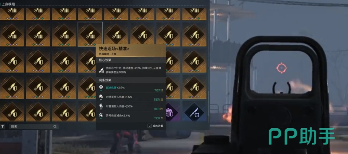 快速返场模组的作用上,主要是通过打针或特定技能直接补满弹药,关键是不会触发换弹动作,避免因换弹导致的输出中断或加成失效,适合依赖换弹叠加BUFF的武器,比如大白鲨便是其中之一,同时还可永久保留换弹后的增益效果。