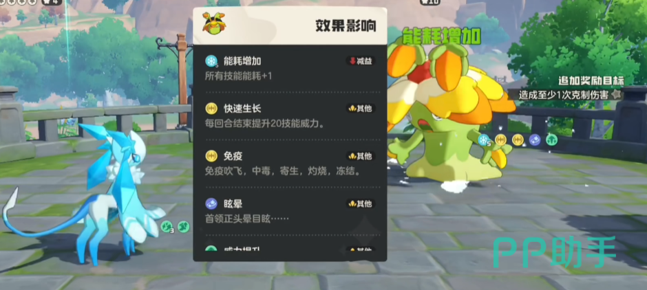 对战时用雪灵触发战斗,世界首领会有2个回合的眩晕状态,先使用热身运动,然后使用冰捆缚,一次冰捆缚有附带5层能耗增加状态,再用一次增加到10层能耗,这时候再切换任意输出精灵,首领就会持续使用获得能量。