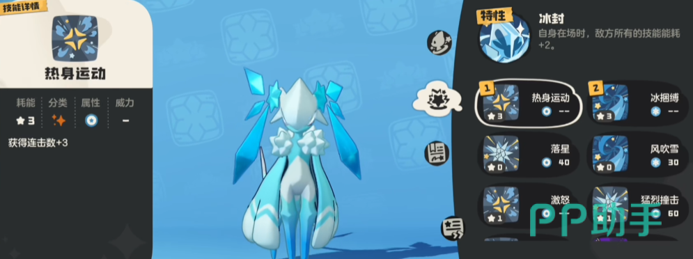 技能方面,其实不需要特别在意,只需要佩戴2个升级自带的技能就行了,分别是热身运动和冰捆缚。因为并不需要雪灵打输出,单纯做一个辅助就行了,所以3、4槽位的技能就不学了。