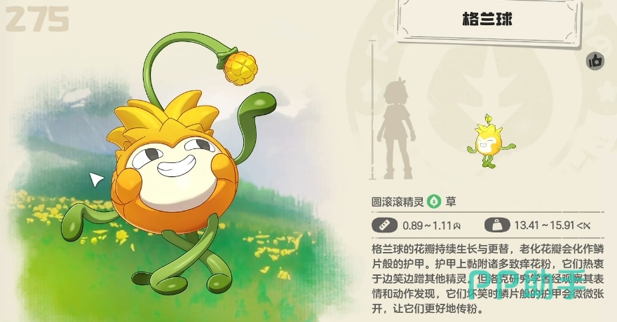 3、格兰球,这是编号为275的精灵,这个属于草系精灵。它会在“回填山涧的魔力之源”附近出现,想要召唤它的话还需要用专属的果实来进行召唤。