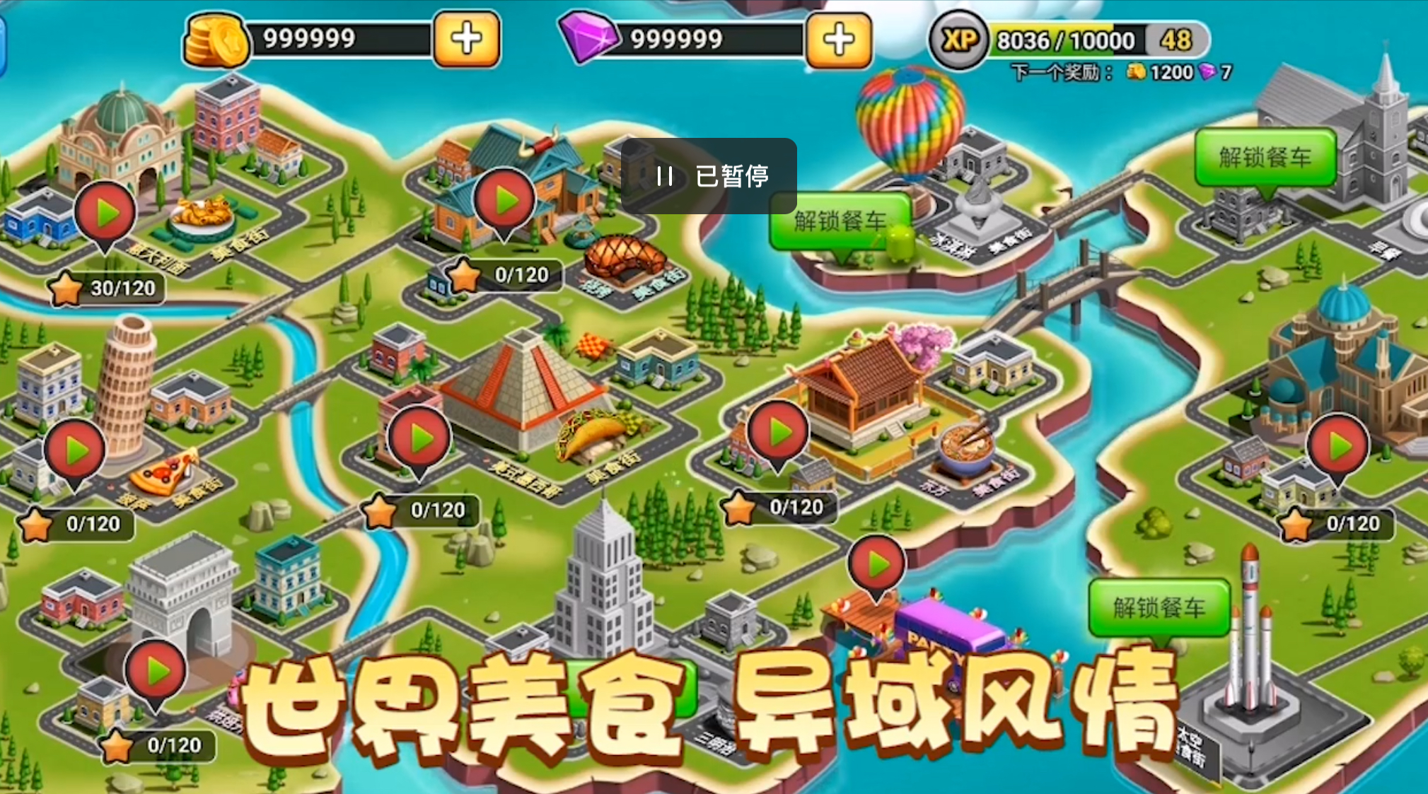这是一款模拟经营类手游,玩家通过不断的制作美食来解锁更多的地图,完成周游世界的梦想之旅!在游戏中,玩家通过给食客们制作食物来赚取金币,然后去解锁不同的地图。当然不要忘记升级你的移动餐车和厨具哦!等级越高,做出的食物就会越好吃,那么赚的金币也会更多!游戏中有丰富的食谱,不同国家和地区的特色美食你都可以进行烹饪,不过最好是能够在规定时间内完成顾客的订单,否则金币奖励就会减半哦!