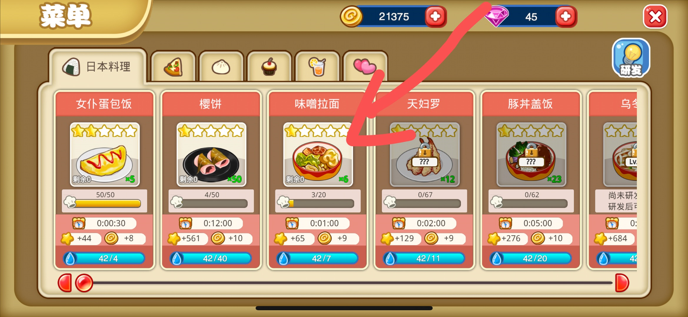 第四步:在总菜单中点击上方的分类,选择要制作的食物的大分类,然后选择订单中的食物,花费一定的体力值制作。