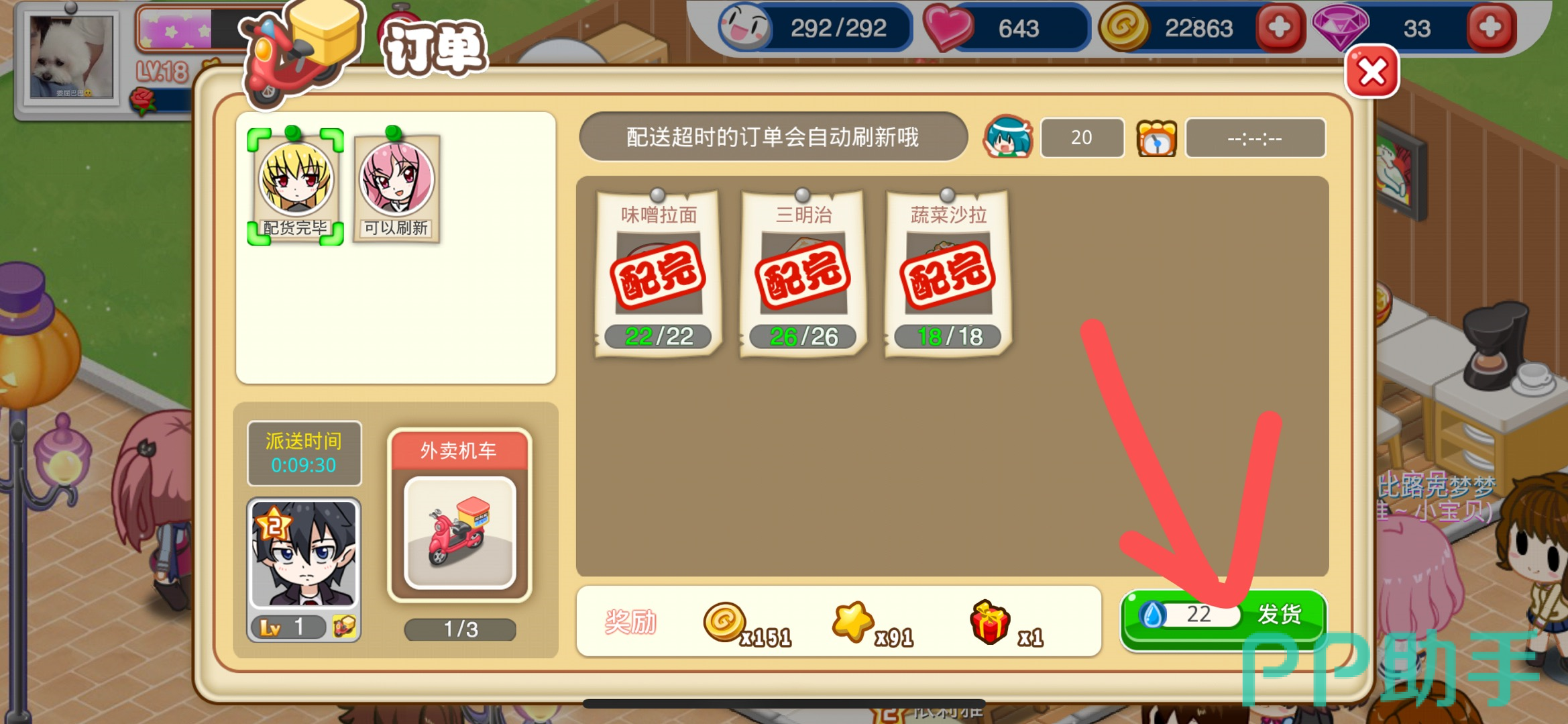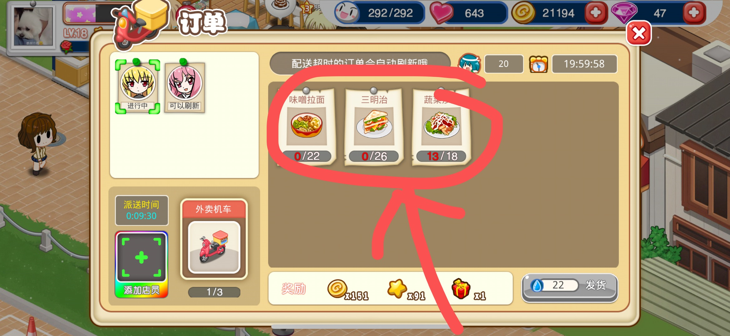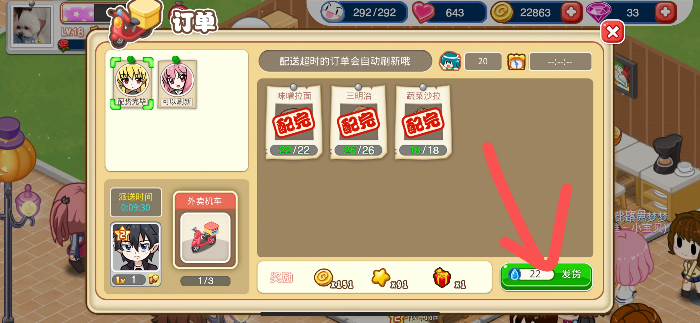 第八步:当物品和人员全部配置好之后直接点击右下角的【发货】图标,等待一定的外卖送货时间就可以完成外卖订单了。