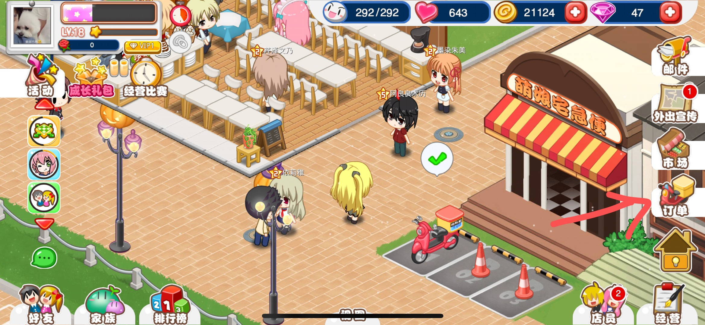 在游戏主界面的右侧菜单栏找到“订单”图标,点击图标进入外卖界面。或者直接点击游戏主界面中的萌娘宅急便前面的摩托车也可以进入外卖界面。