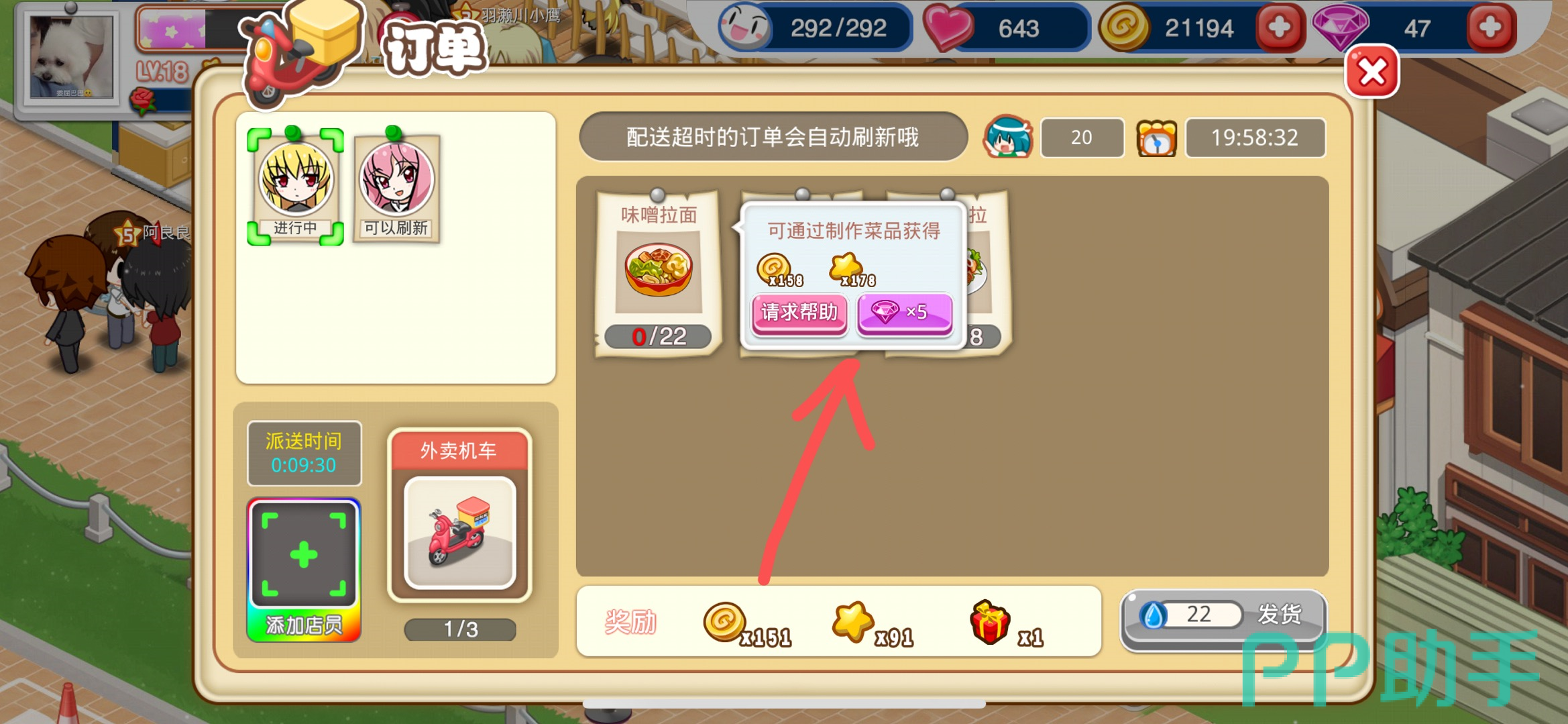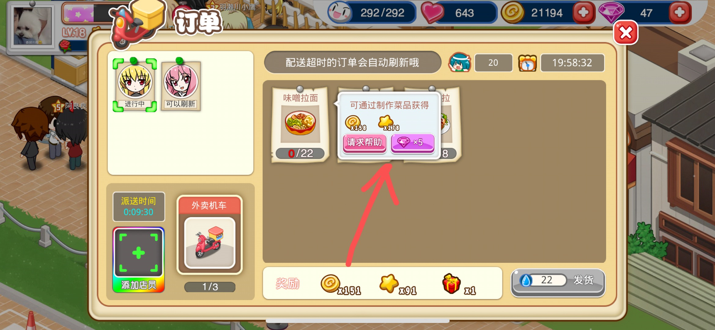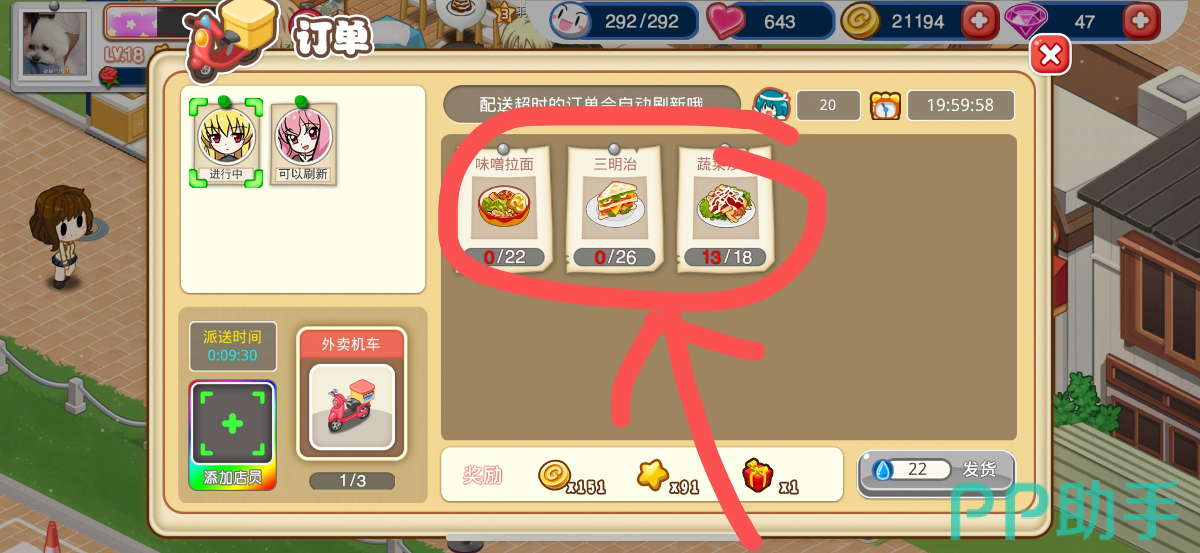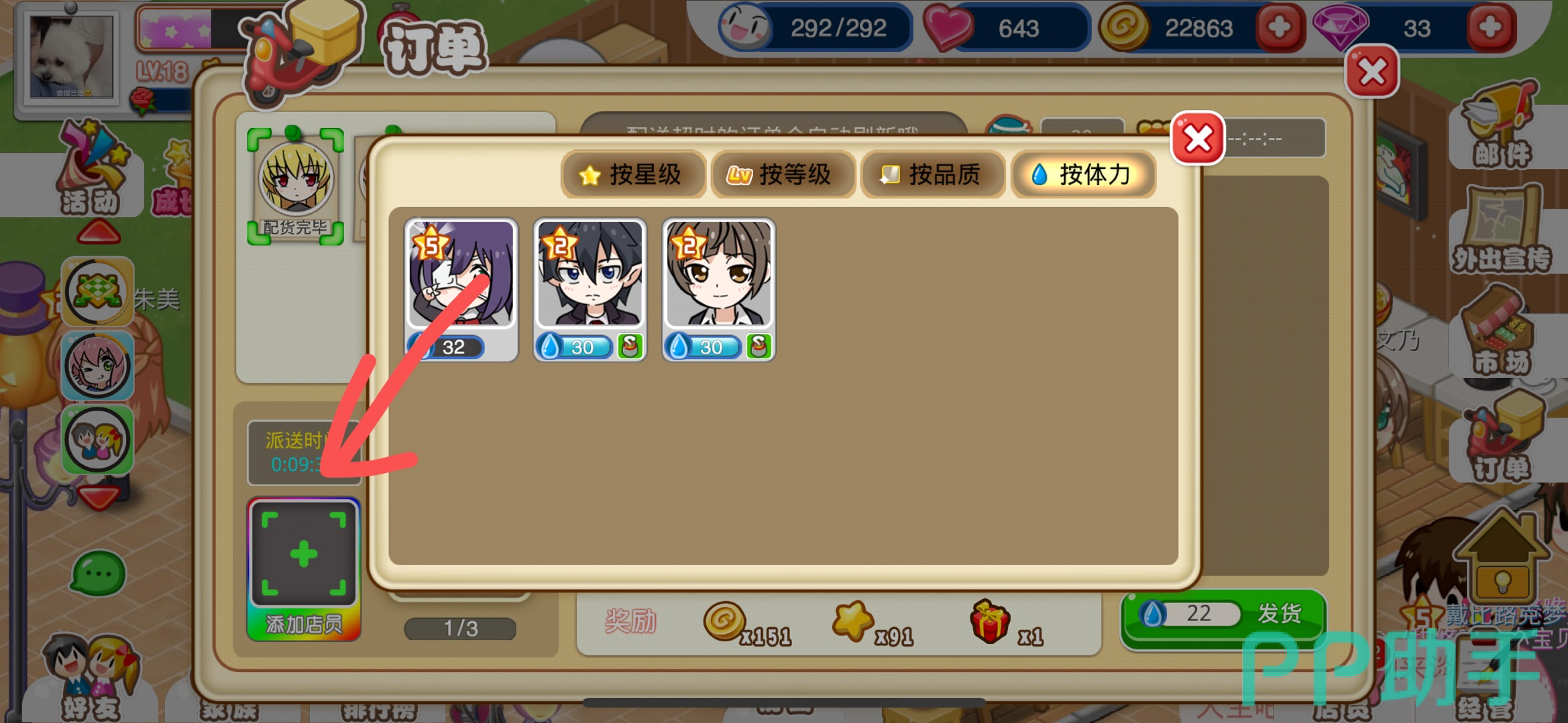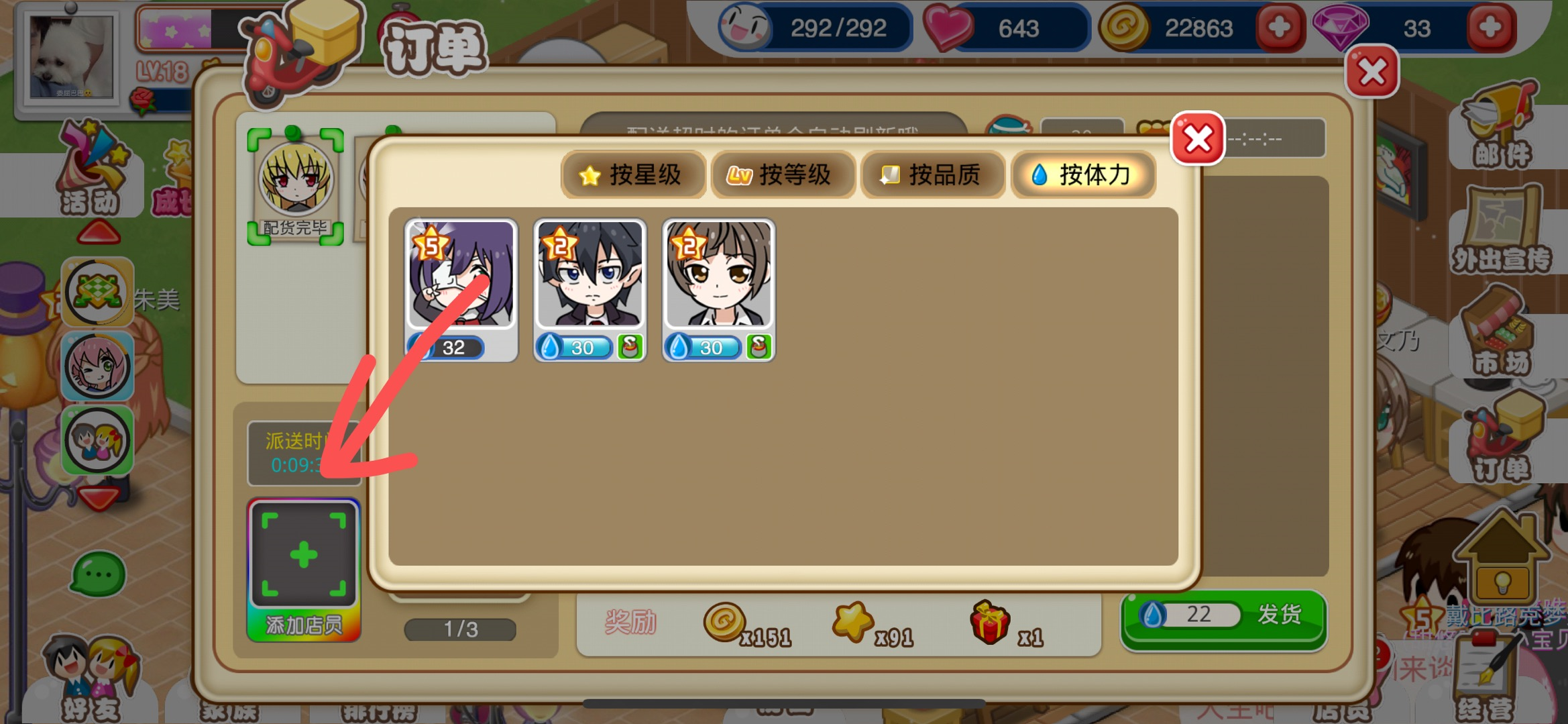 第七步:配货完成之后,我们还需要点击订单左下角的送货员方框,分配一个体力值足够的店员去送货。