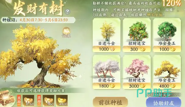等到摇钱树成熟后,将会返还种子的购买成本,并且还能额外获取绑定金锭,每日对摇钱树进行浇水、除草等行为还能提高树木的养护值,若养护达到一定程度,还会提升最终的绑定金锭奖励。