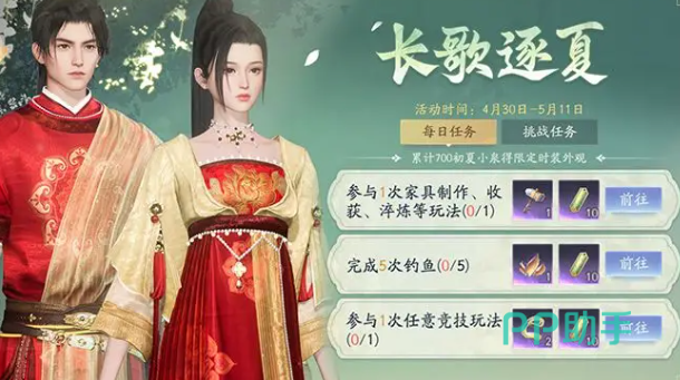 长歌逐夏,时间为4月30日到5月11日,参与条件是达到30级,大家在这一期间只要完成指定任务就可以领取,限定时装外观长安歌、寻武令等奖励内容,然后是发财有树,时间是4月30到5月13日,在这个期间满30级的玩家可以购买摇钱树进行栽培。