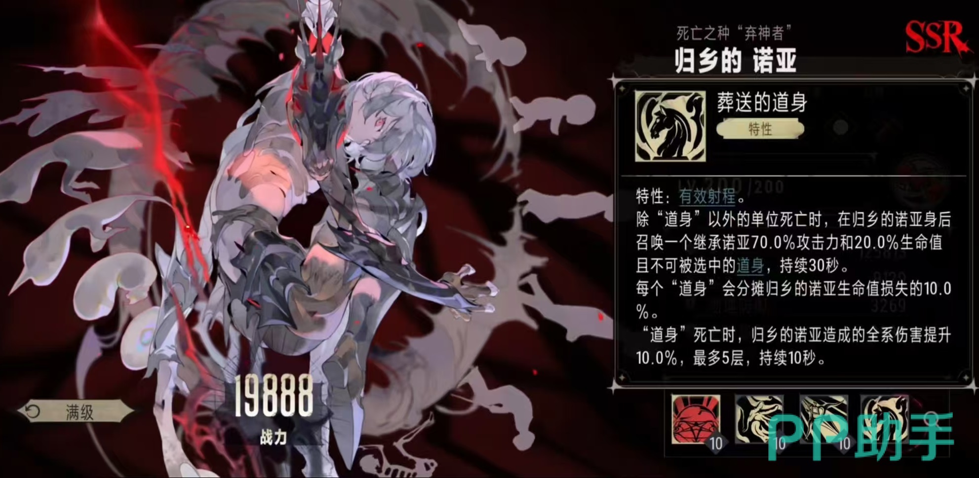 场上的每个道身,都会分摊归乡的诺亚受到的生命损失的10%,在道身死亡时,归乡的诺亚造成全系伤害提升10%,最多叠加5层,持续10秒钟。通过这些技能效果不难看出,归乡的诺亚最适合的就是走召唤队路线,利用召唤物为核心,形成强大的战斗力。也可以走范围输出队的搭配思路,例如和拉米娅、阿卡贝拉、希波蒂等一起组成队伍,输出非常狂暴。