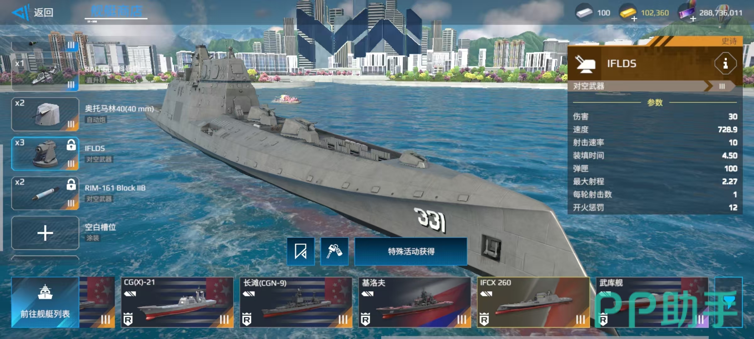 自身的武器中锁定的也比较多,尤其是主炮全都是锁定的,包括两座AGS155毫米口径,一座兰卡塔100毫米口径,四座兰塔卡76毫米口径。还有三座对空武器锁定为IFLDS,两座防空导弹RIM-161也是锁定的。自身在属性方面,速度如果和其他巡洋舰相比,那么并不算突出,难以在这一方面取得优势。机动性虽然不错,但是船体较长,所以近距离转向等有些困难,并不适合在近距离作战。雷达范围比较出色,可以在较远处处发现目标,这算是一个优势。