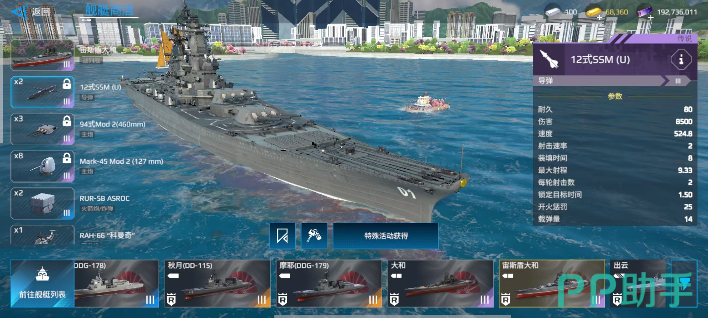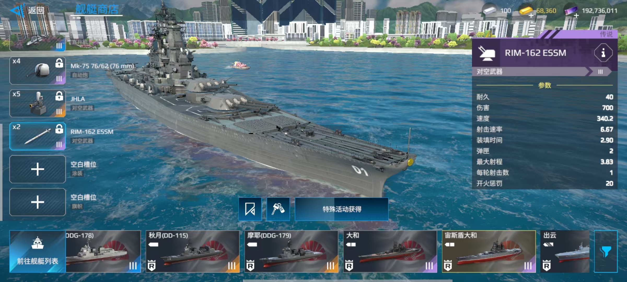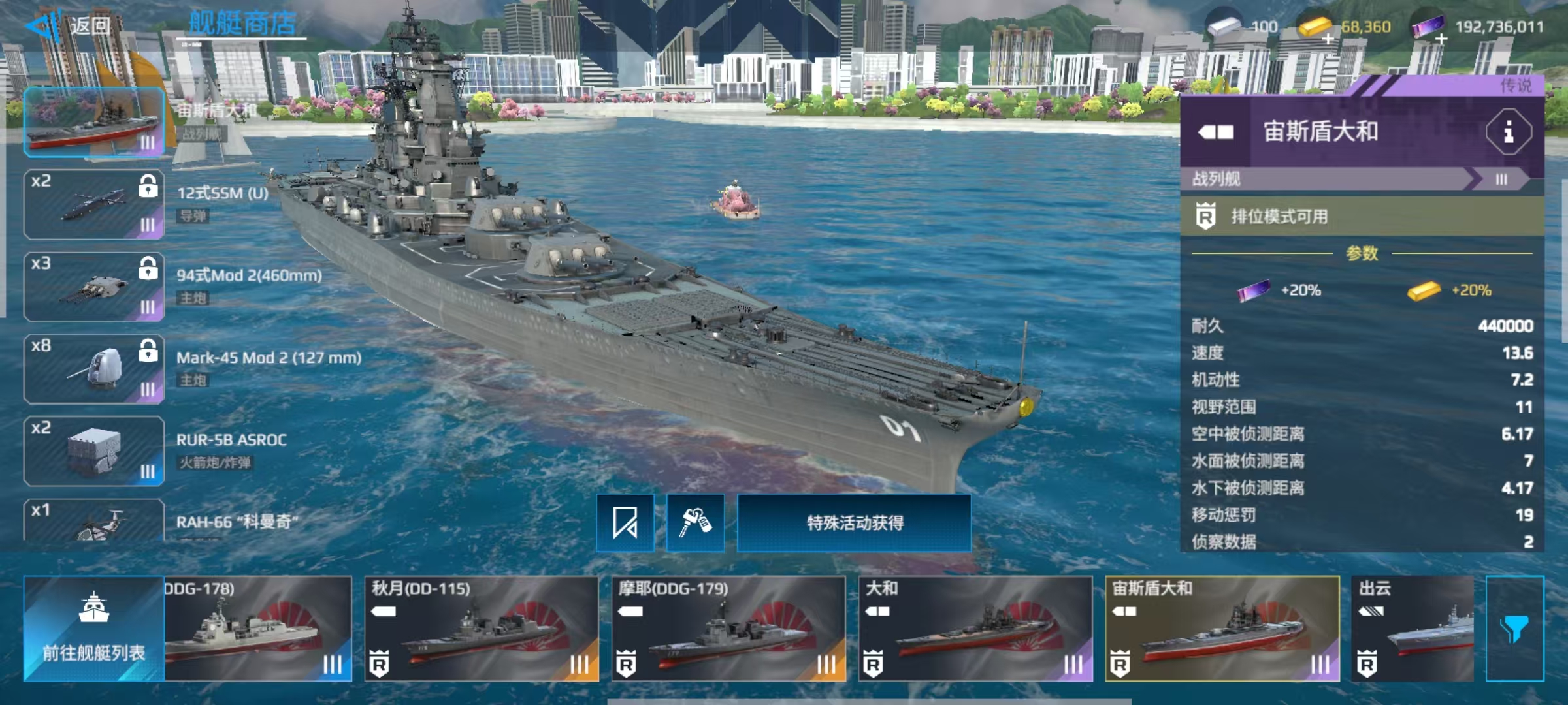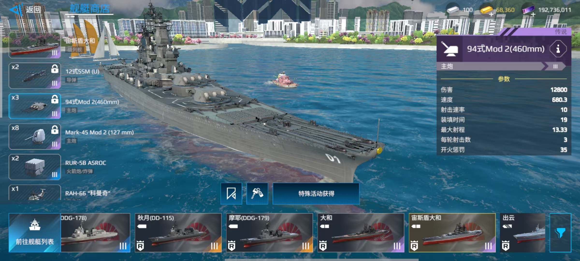 除此之外,还有Mk-75自动炮、RIM-162对空武器等,可以更换的武器是比较少,主要包括舰载直升机和火箭炮。大家在了解了属性和自身所携带的装备之后,对于这艘舰船也就有了比较清楚的认识,在血量方面非常有优势,自身主炮更是所有战列舰中最强的一个。防控能力方面存在短板,机动性也比较差,缺乏远程作战能力和容易成为对方集火的目标。