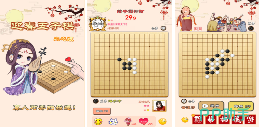 迎春五子棋,是一个有着浓厚传统元素设定的五子棋游戏,在这个游戏里会打造一个相对比较古典的场景,玩家可以和游戏里设定的电子古风人物一较高下,也可以选择和自己的好友在游戏里共同匹配,每一局赢得胜利之后都能获得一个福字,只有集齐五福才能获得更高的分数。