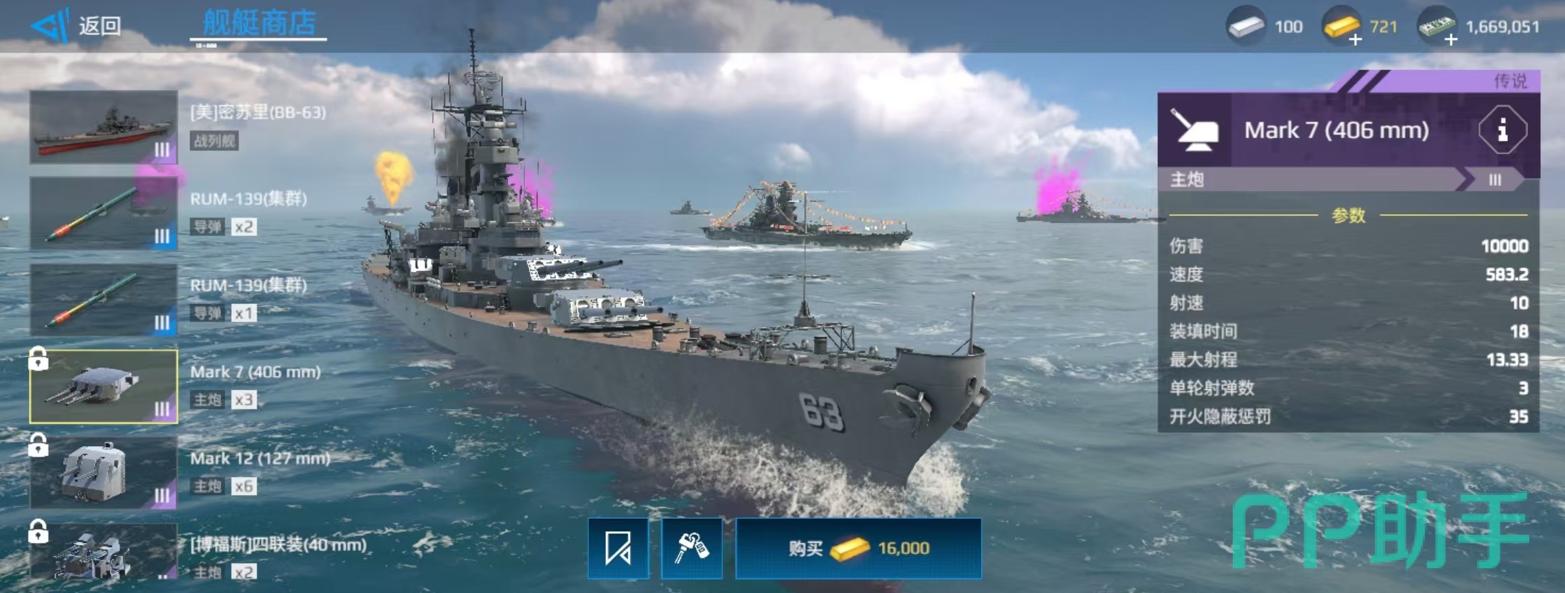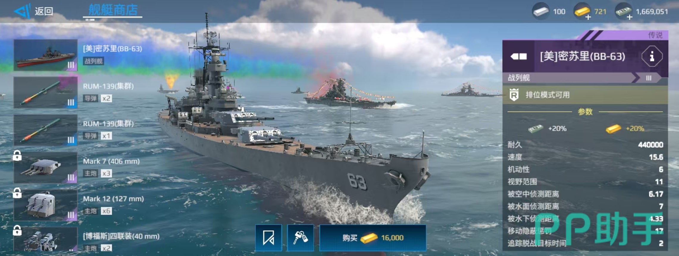 再来看一下密苏里号的基础属性,在达到满值时,耐久572000,速度20.2节,机动性7.86,视野范围13.2千米。所配置的武器包括三座导弹十一座主炮,四座防空和一架直升机。其中所有的主炮都是锁定类型,其余位置可以更换。综合这两艘舰船的主要属性以及武器配备,大家不难看出,在耐久方面相差无几,速度方面密苏里更有优势。武器方面,将经过现代化改装的密苏里拥有导弹。在其他武器配置方面也更加均衡。