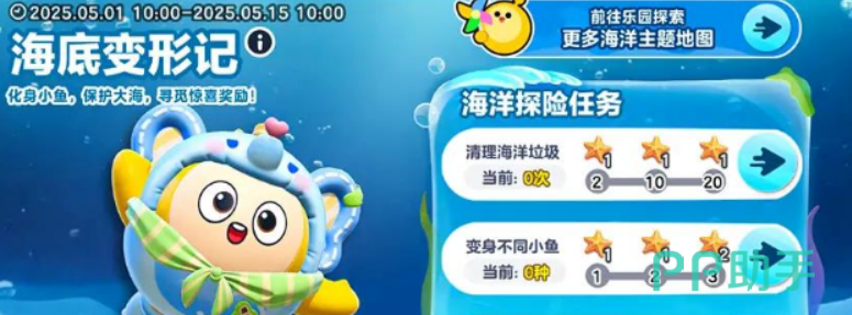 本次活动的核心内容名为“海底大冒险”,将于5月1日正式开启。玩家在进入该活动场景后,会自动变身为各种小鱼角色。这些小鱼拥有不同的外观与设定,并非仅仅是外形变化,而是为整张地图增添了更多的趣味与辨识度。在这个全新的海底地图中,玩家的主要任务是清理海洋中的垃圾,通过完成任务逐步推进活动进度。