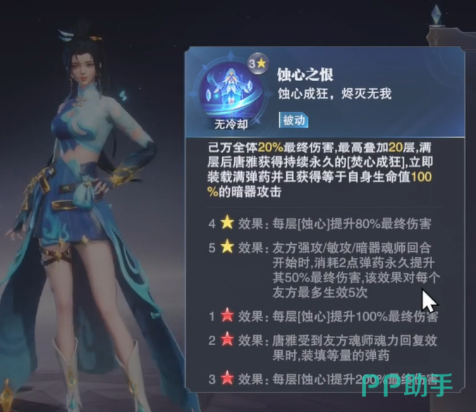 你可能会想,这样的增伤效果一定是非常依赖她的星级。猜测是对的。唐雅的效果随着星级的提升而变得更加可怕。黄4星时,她每积累一层“蚀心”,友方的最终伤害就提升80%,这个提升幅度可不是一般的魂师能比的。而到了黄5星,她不仅能在强攻、敏攻、暗器回合为队友增伤40%,甚至还能在每回合增加敌方伤害的同时大幅提升队伍的整体输出。