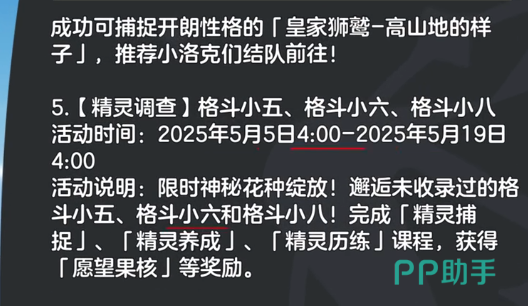 游戏会在5月5号开启精灵调查的活动,这也是大家获取精灵的关键。在活动期间,只要玩家可以打败花种,在战斗的过程中就能有机会得到格斗小五、小六以及小八。而这一个活动对于玩家而言还是比较有作用的,可以更快的收集到自己所喜欢的精灵。